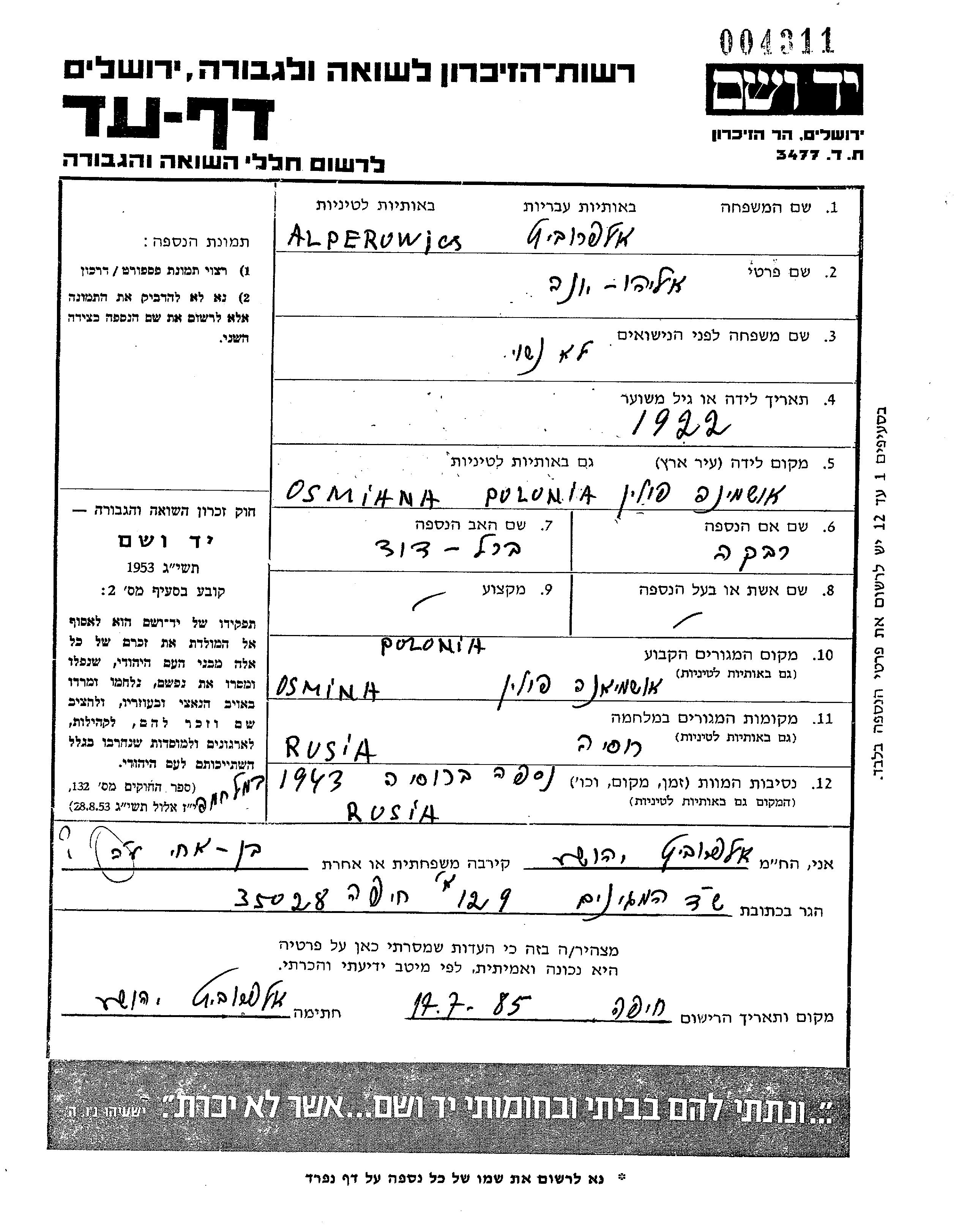 Eliahu Yona Alperowics wurde im Jahr 1922 in Oszmiana, Polen geboren. Er war der Sohn von Berl David und Rivka. Er war Ledig. Vor dem Zweiten Weltkrieg lebte er in Oszmiana, Polen. Während des Krieges war er in Russland (UdSSR).