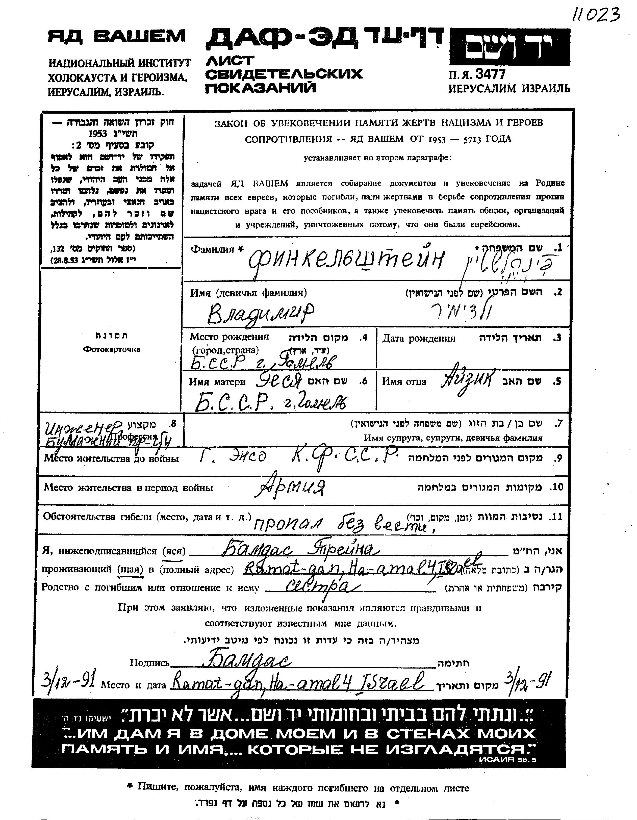Vladimir Finkelshtein wurde in Gomel, Weißrussland (UdSSR) geboren. Er war der Sohn von Aizik und Gesia. Er war Ingenieur. Vor dem Zweiten Weltkrieg lebte er in Enso, Russland (UdSSR). Während des Krieges war er in die Sowjetischen Streitkräfte.