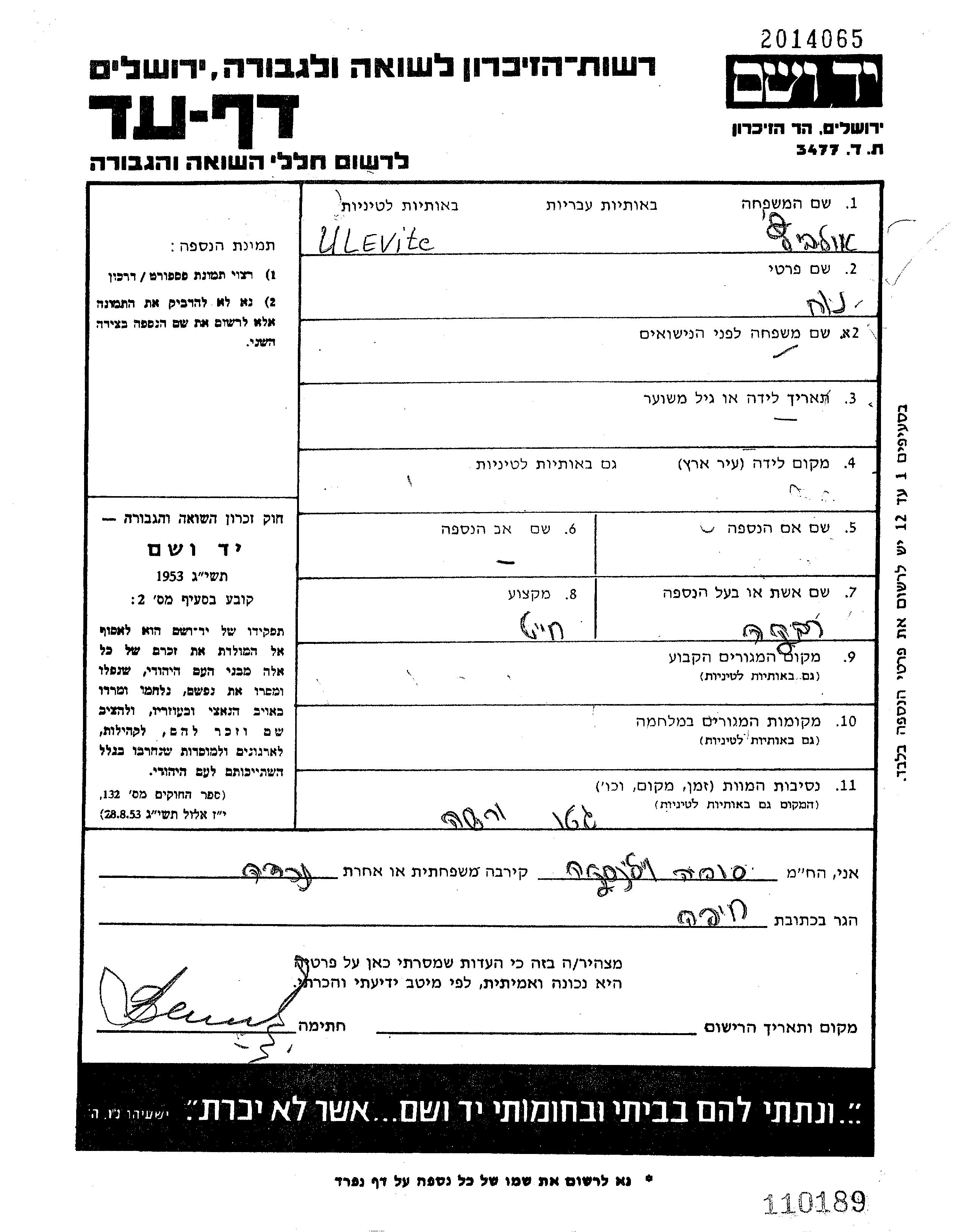 Noakh Ulevitc wurde in Pinsk, Polen geboren. Er war Schneider und mit Rivka Verheiratet. Vor dem Zweiten Weltkrieg lebte er in Pinsk, Polen. Während des Krieges war er in Pinsk, Polen.