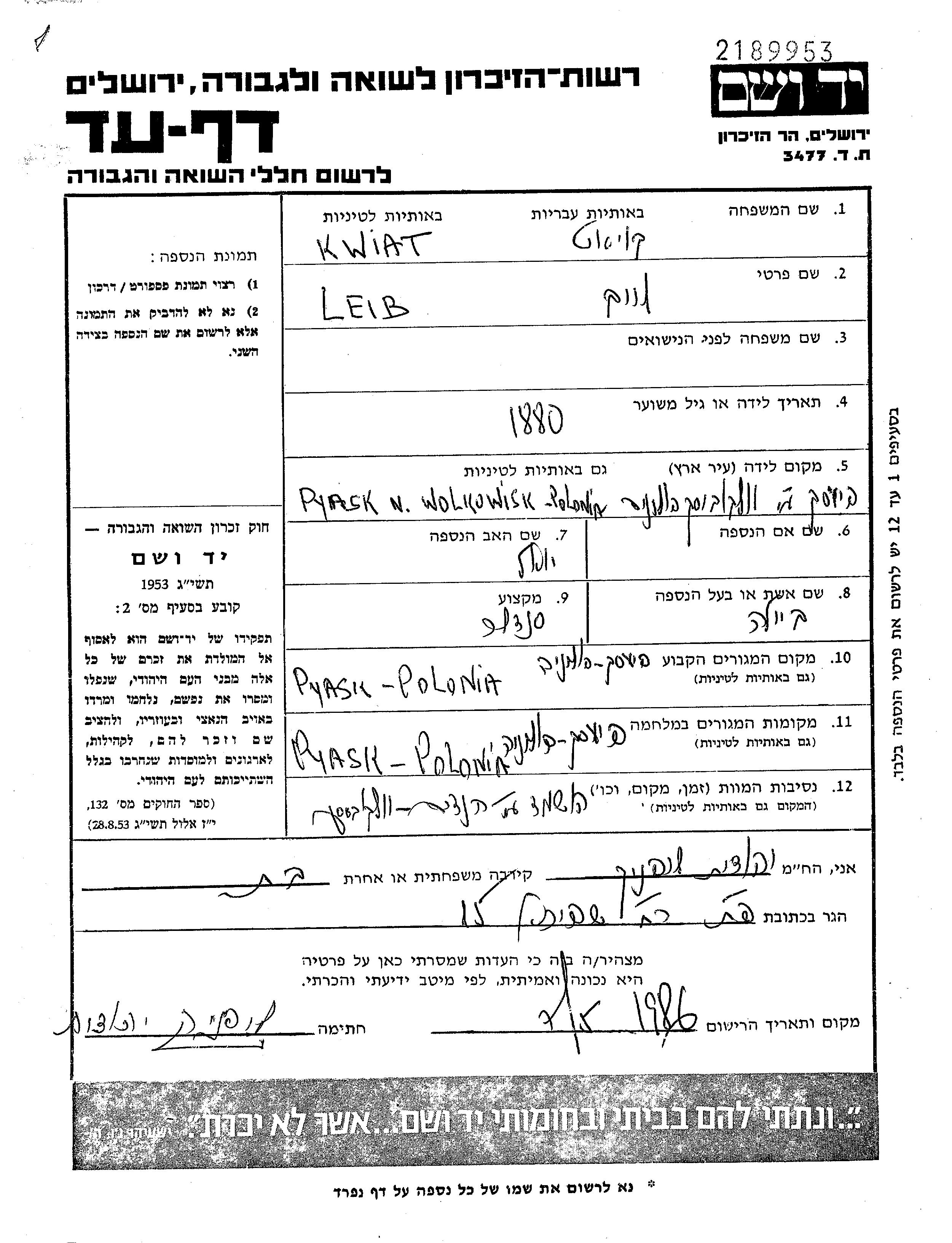 Leib wurde in der Schoah ermordet. Todesort: Wolkowysk, Polen.