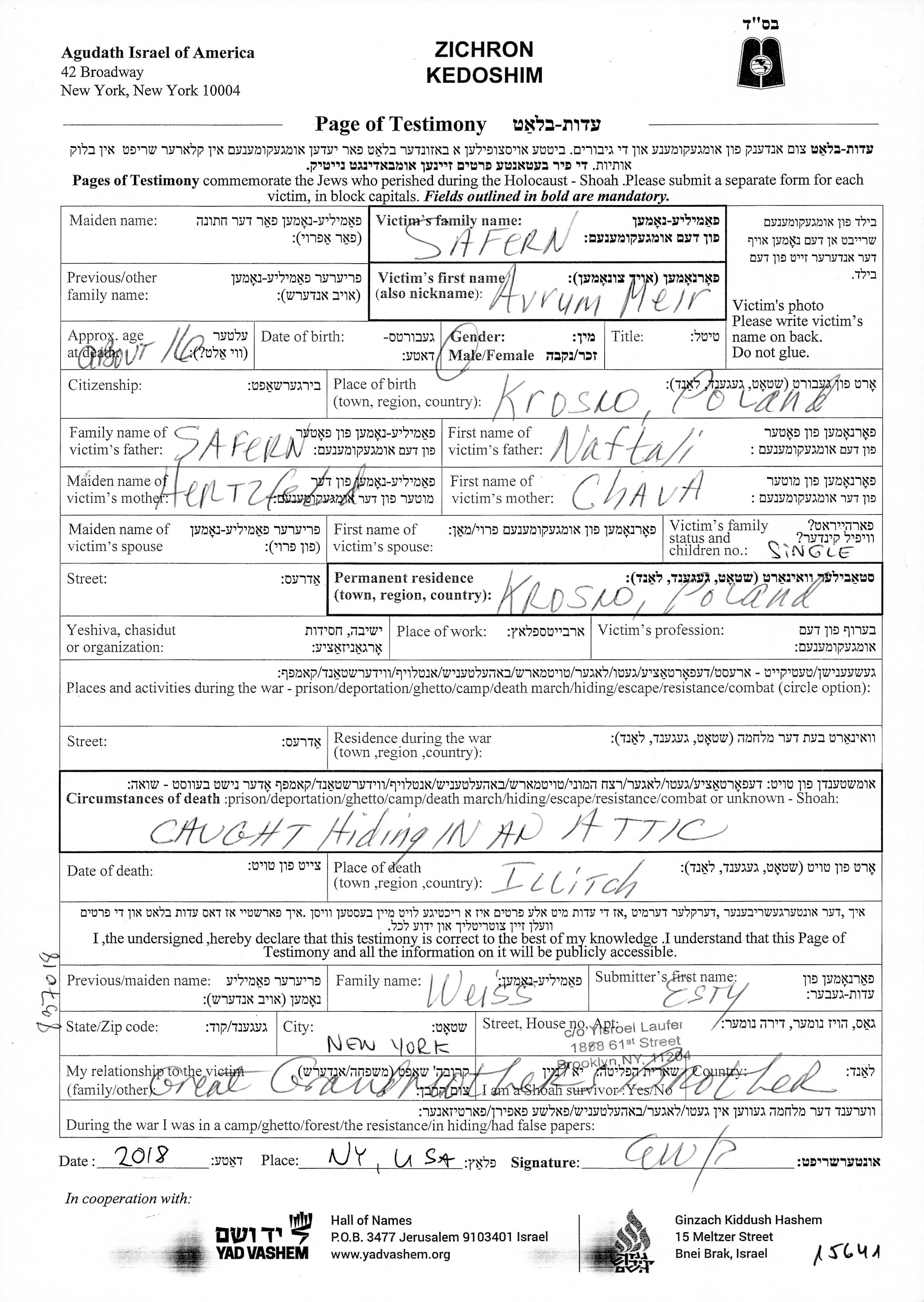 Avrum Meir Safern wurde in Krosno, Polen geboren. Er war der Sohn von Naftali und Chava, geb. Hertzfeld. Er war Kind. Vor dem Zweiten Weltkrieg lebte er in Krosno, Polen.