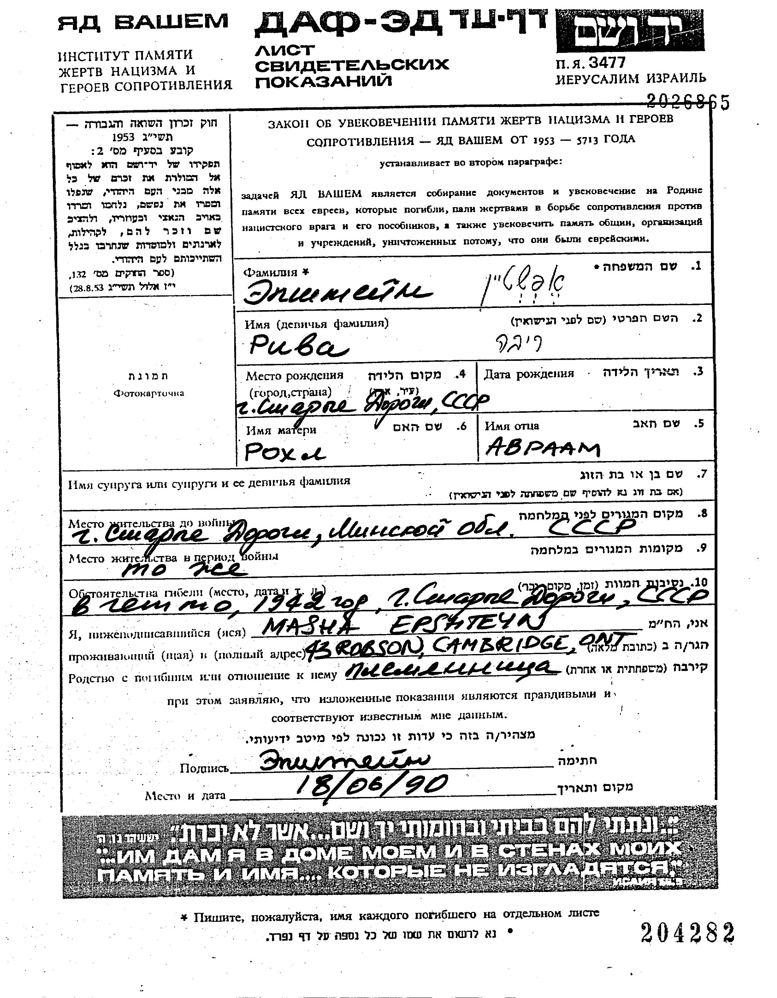 Riva Epshteyn wurde im Jahr 1925 in Staryye Dorogi, Weißrussland (UdSSR) geboren. Sie war Schüler/-in. Vor dem Zweiten Weltkrieg lebte sie in Staryye Dorogi, Weißrussland (UdSSR).