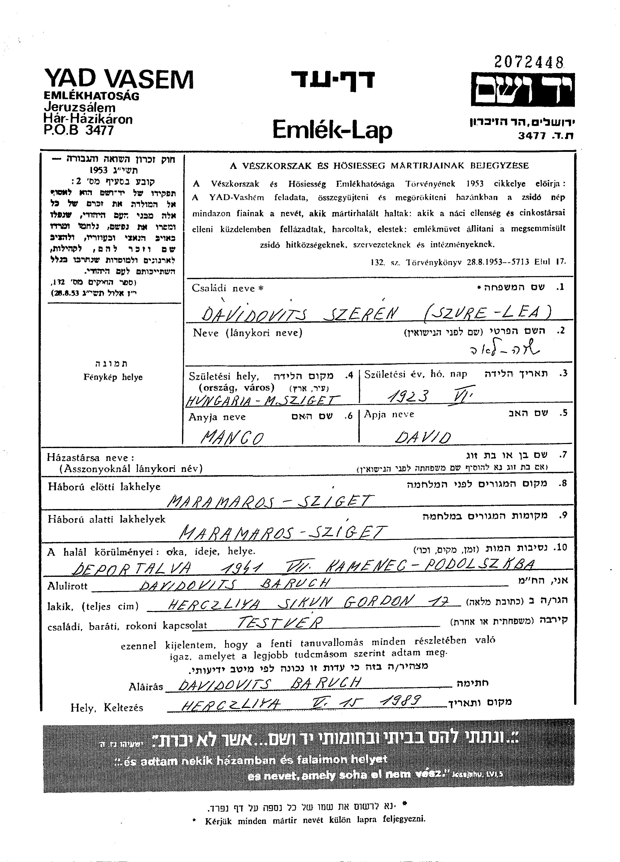 | Davidovits | Szure Lea | 1923 | Maramarossziget, Rumänien | Gedenkblatt |