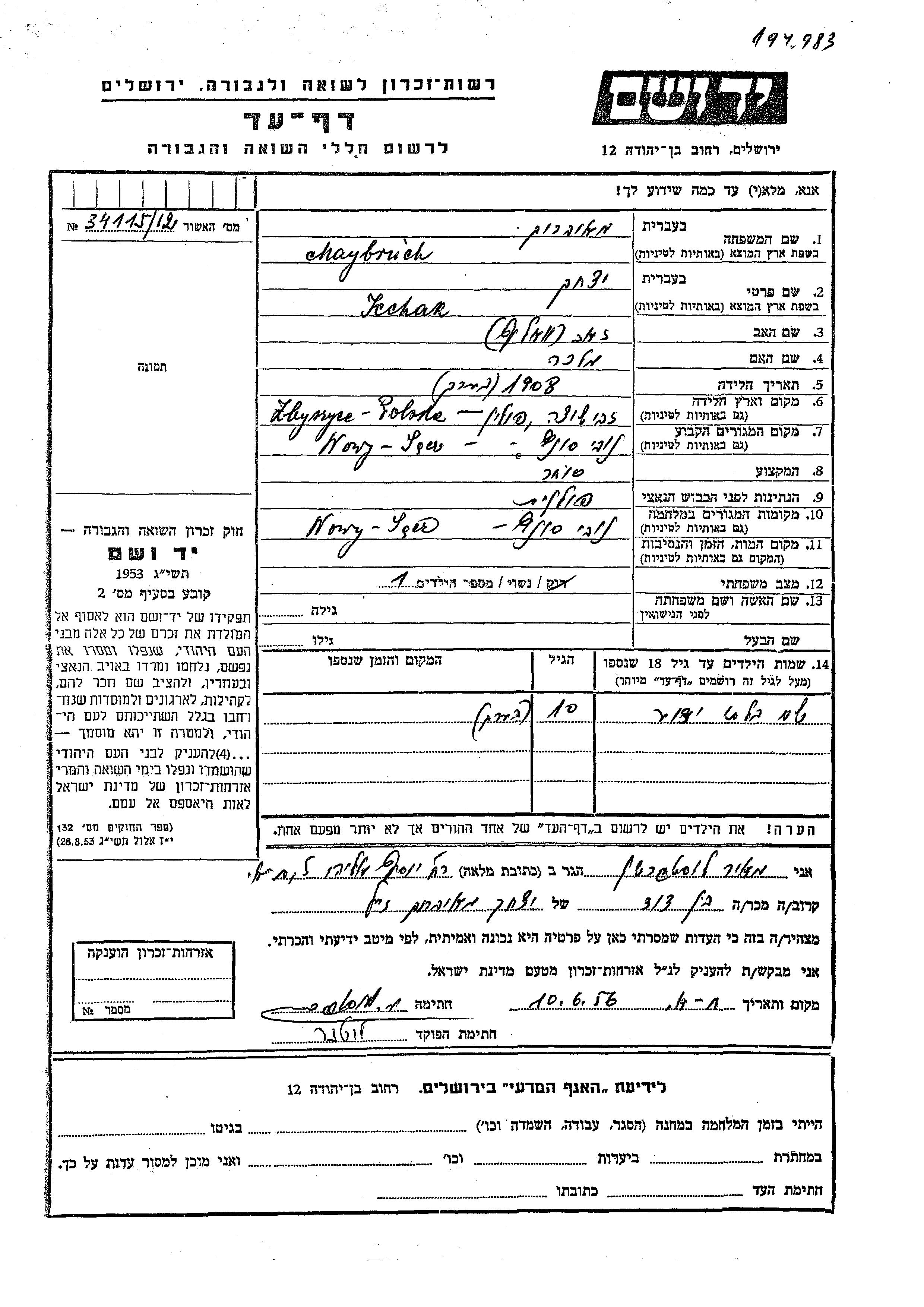 Isack Maybruch wurde im Jahr 1907 in Zbyszyce, Polen geboren. Er war Kaufmann/-frau. Vor dem Zweiten Weltkrieg lebte er in Nowy Sacz, Polen.