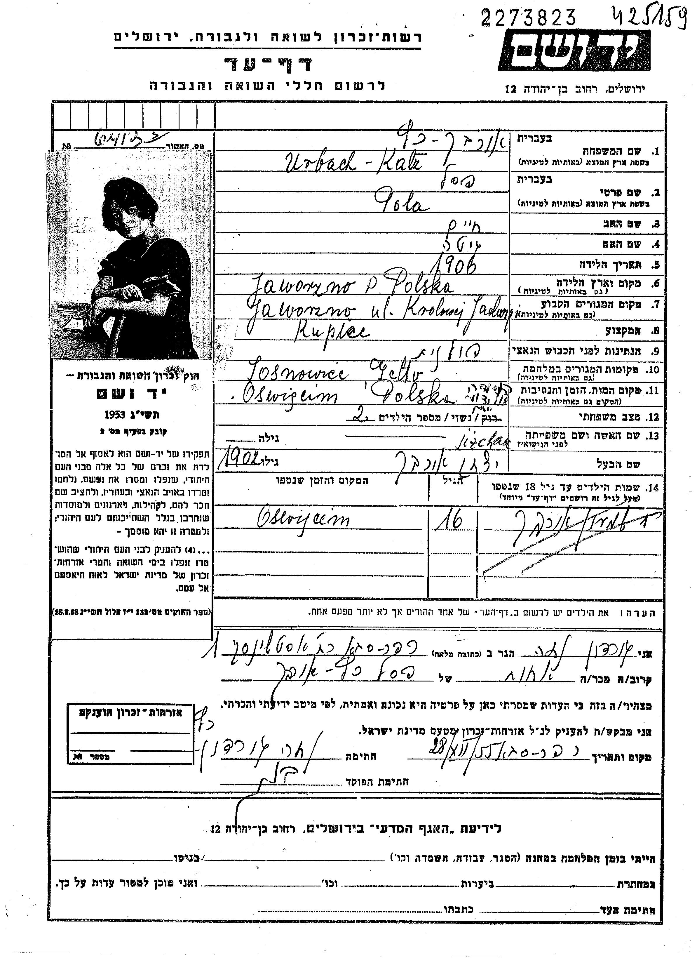 Pesil Pepcia Pola Urbakh, geb. Katz wurde im Jahr 1905 in Polen geboren. Sie war Kaufmann/-frau. Vor dem Zweiten Weltkrieg lebte sie in Jaworzno, Polen.
