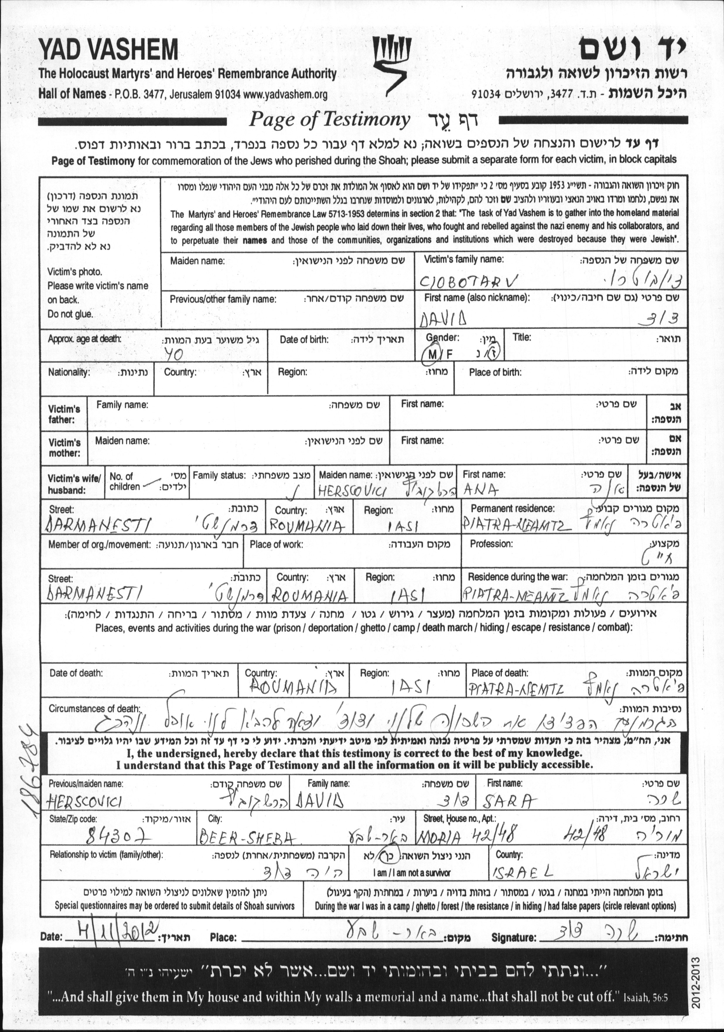 David wurde in der Schoah ermordet. Todesort: Piatra Neamt, Rumänien im Jahr 1944.