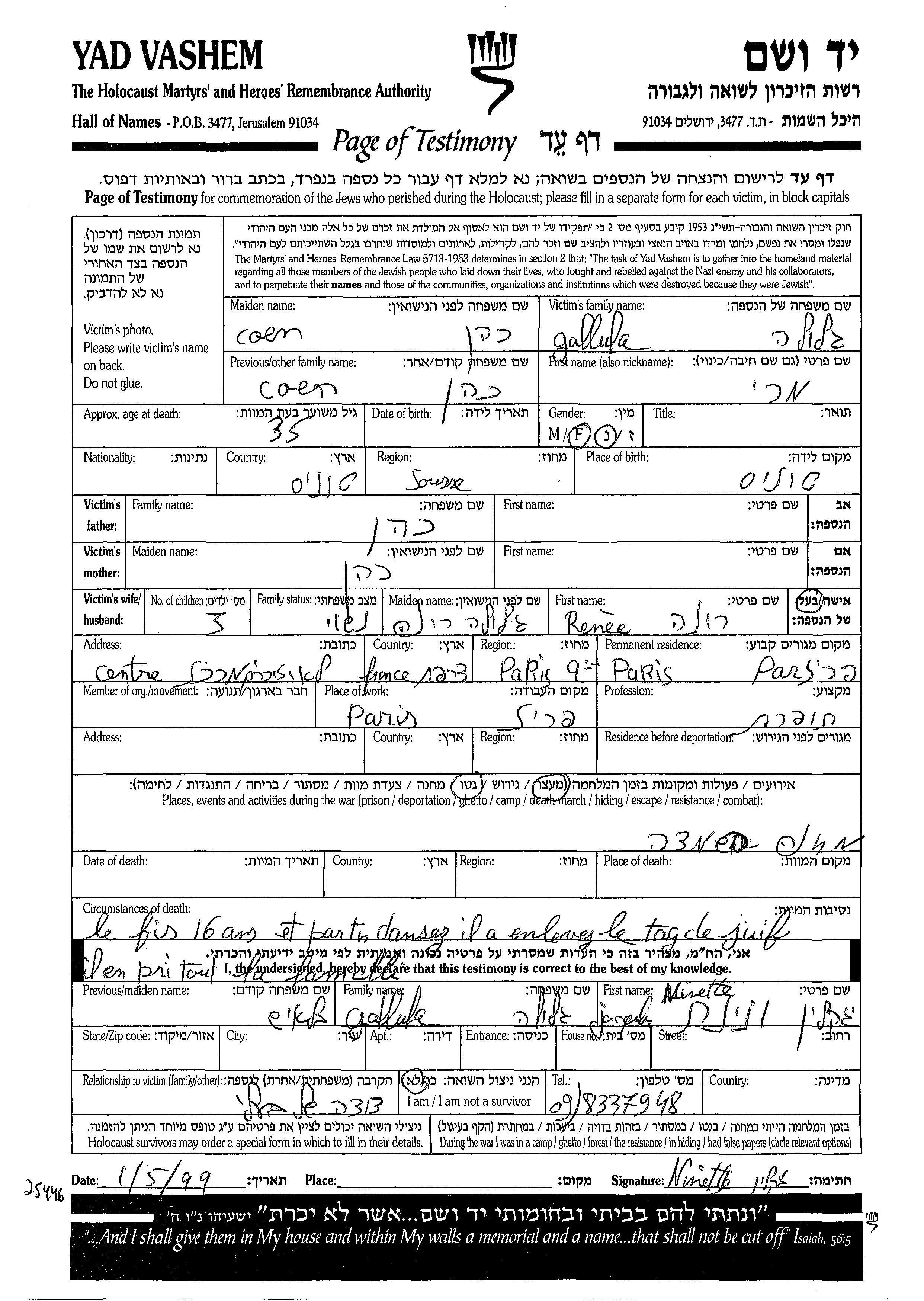 Mari Gallula, geb. Coen wurde in Tunis, Tunesien geboren. Sie war Schneiderin. Vor dem Zweiten Weltkrieg lebte sie in Paris, Frankreich.