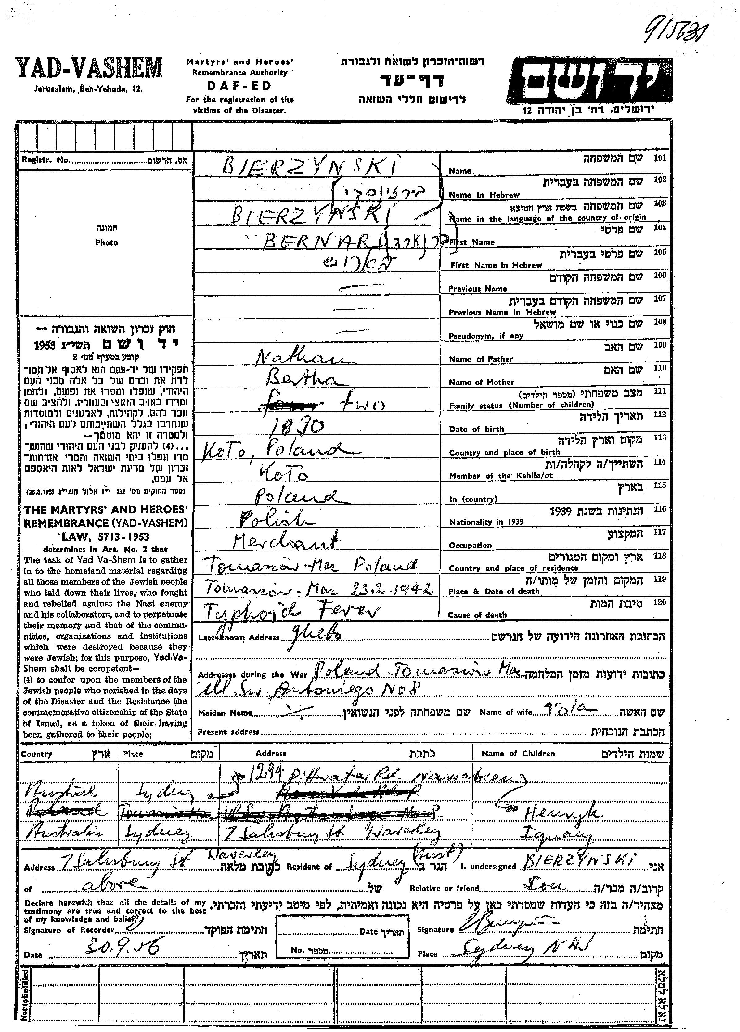 Bernard Boris Bierzynski wurde im Jahr 1890 in Kolo, Polen geboren. Vor dem Zweiten Weltkrieg lebte er in Tomaszow Mazowiecki, Polen.