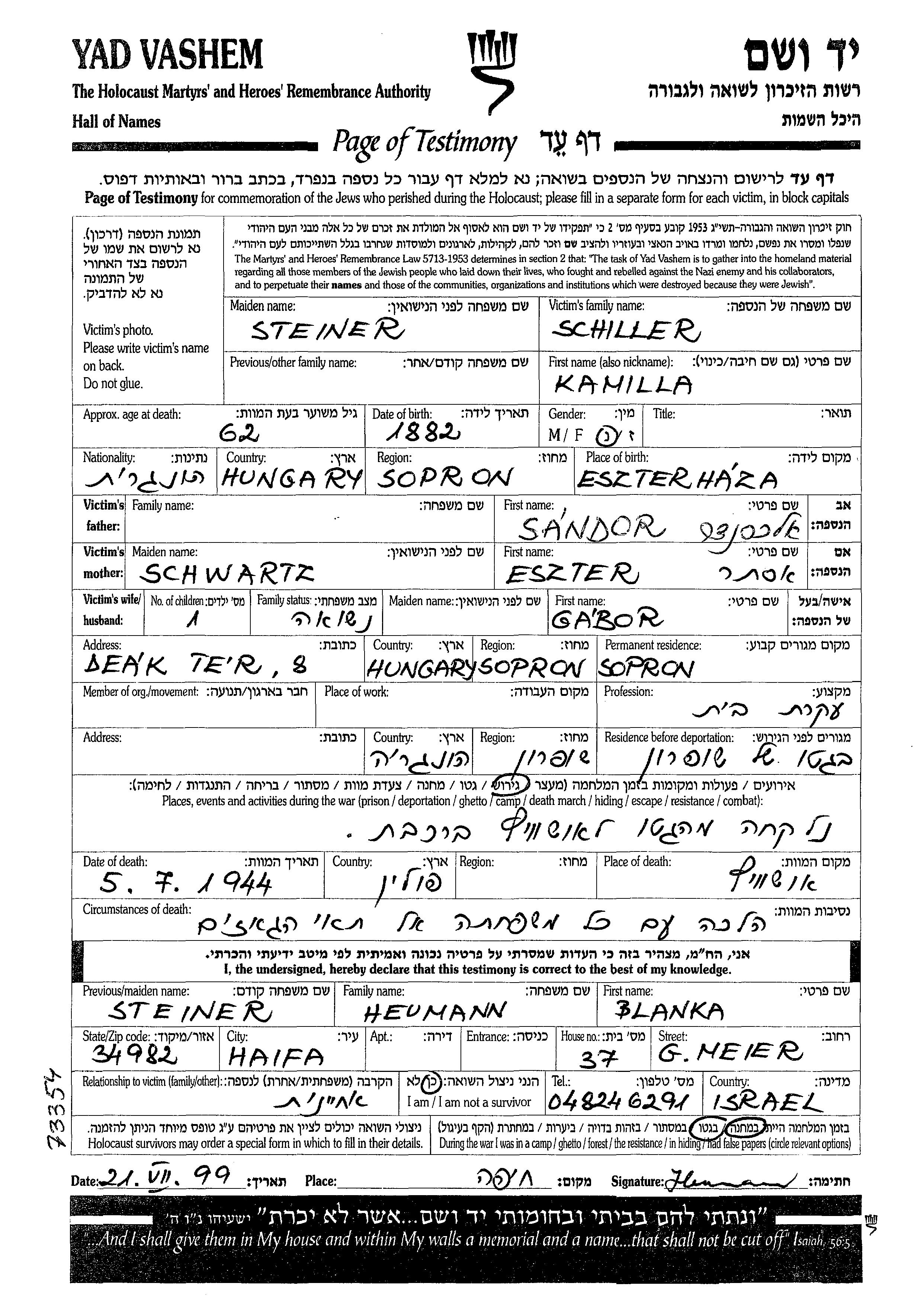 Schiller Kamilla 1888 Sopron, Ungarn Verfolgtenliste
