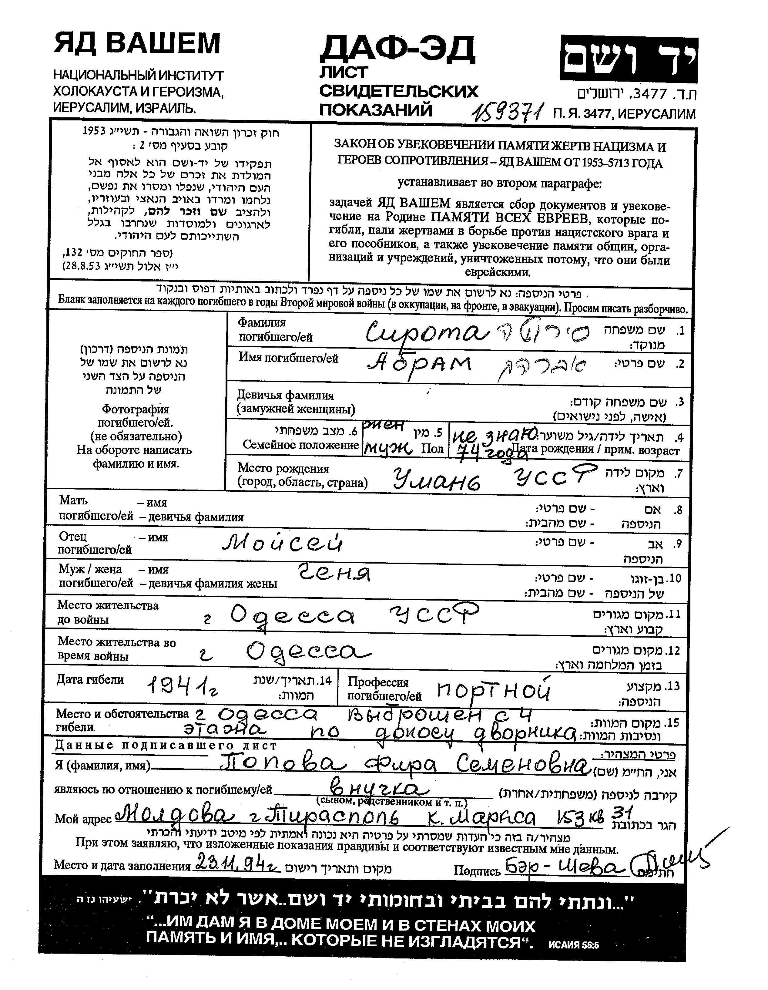 Sirota | Abram | 1869 | Tiraspol, Ukraine (UdSSR) | Gedenkblatt |
