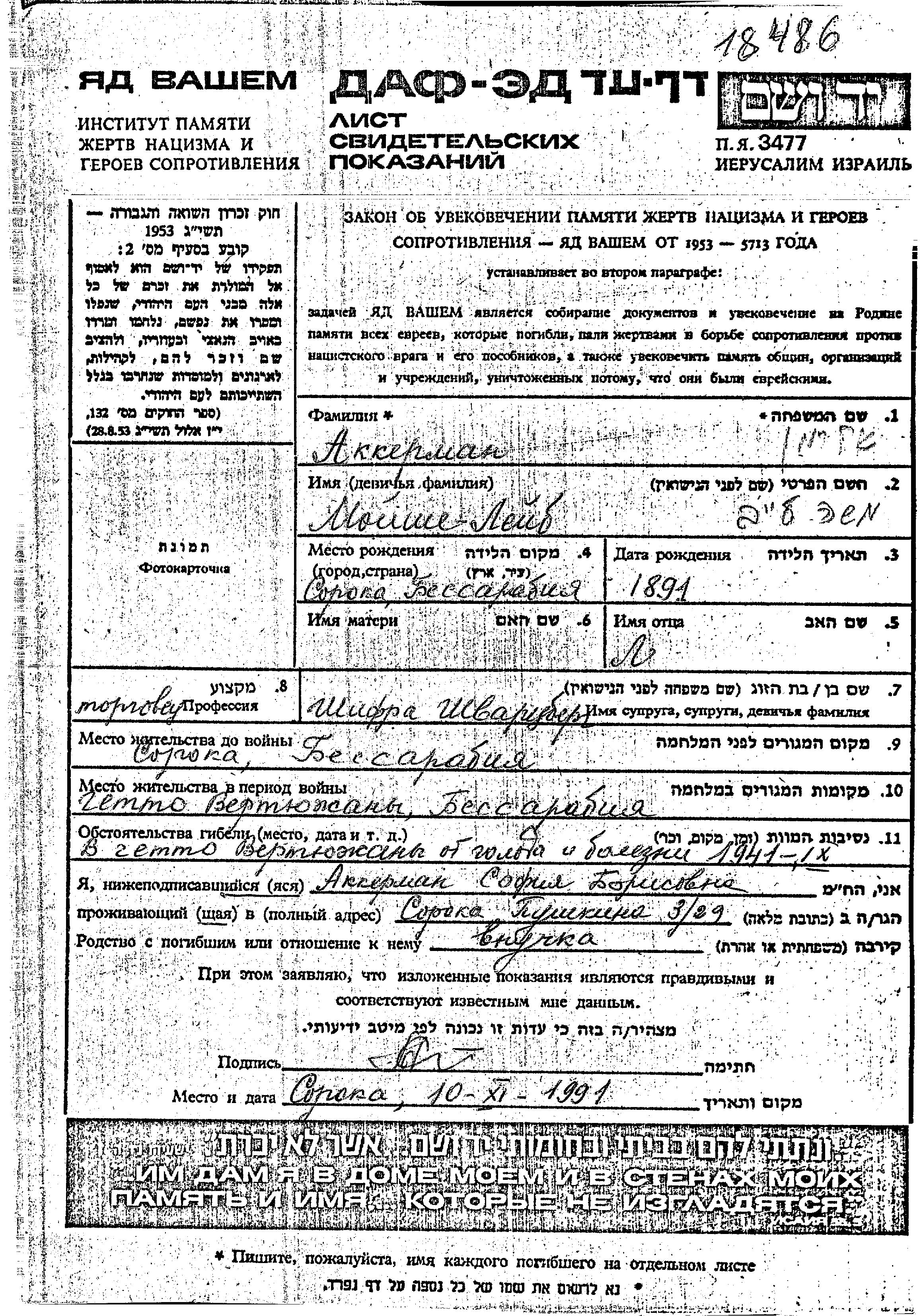Leib Moshe Akerman wurde im Jahr 1891 in Soroca, Rumänien geboren. Er war Kaufmann/-frau. Vor dem Zweiten Weltkrieg lebte er in Soroca, Rumänien.