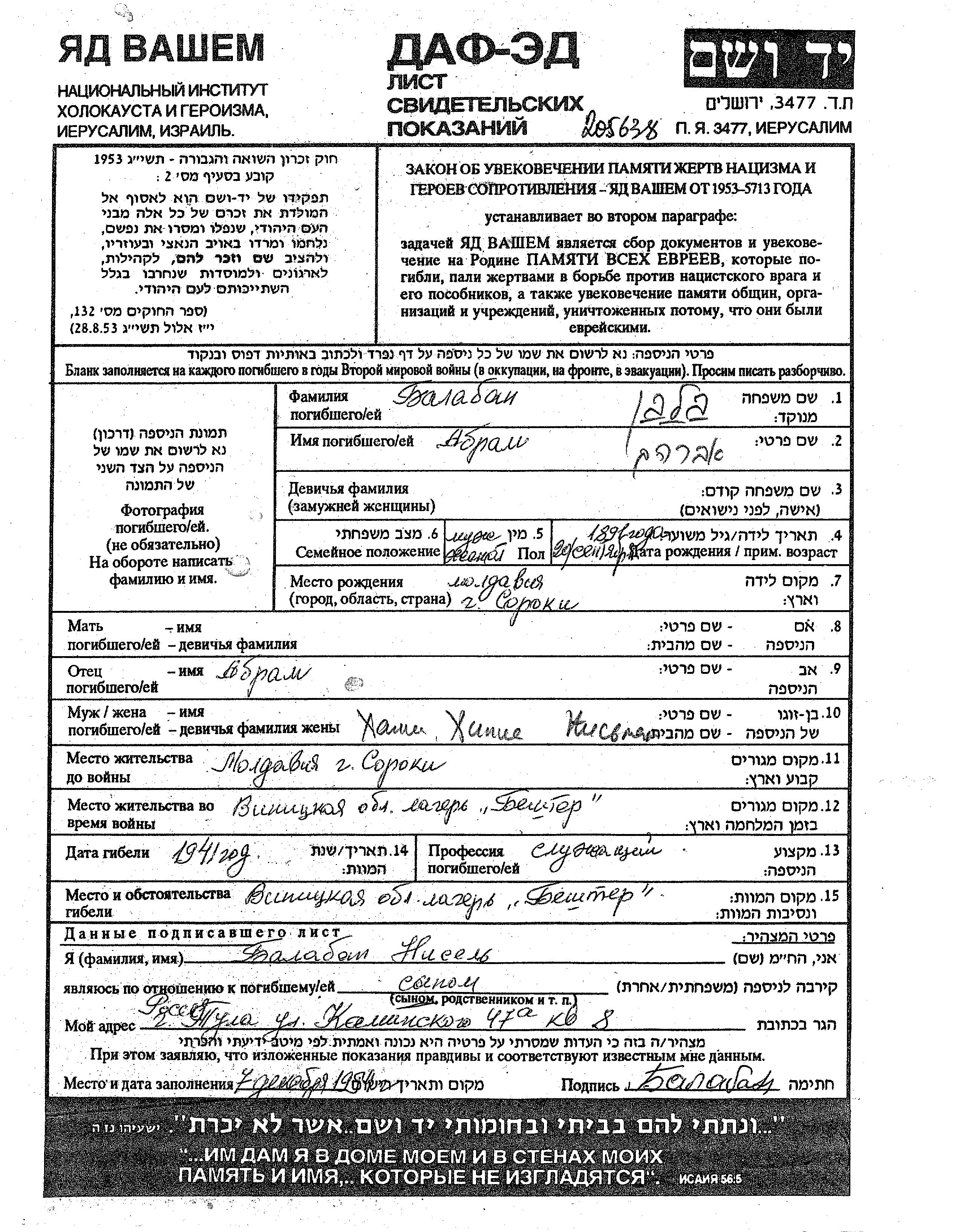 Avraham wurde in der Schoah ermordet. Todesort: Vinnitsa, Ukraine (UdSSR) im Jahr 1941.