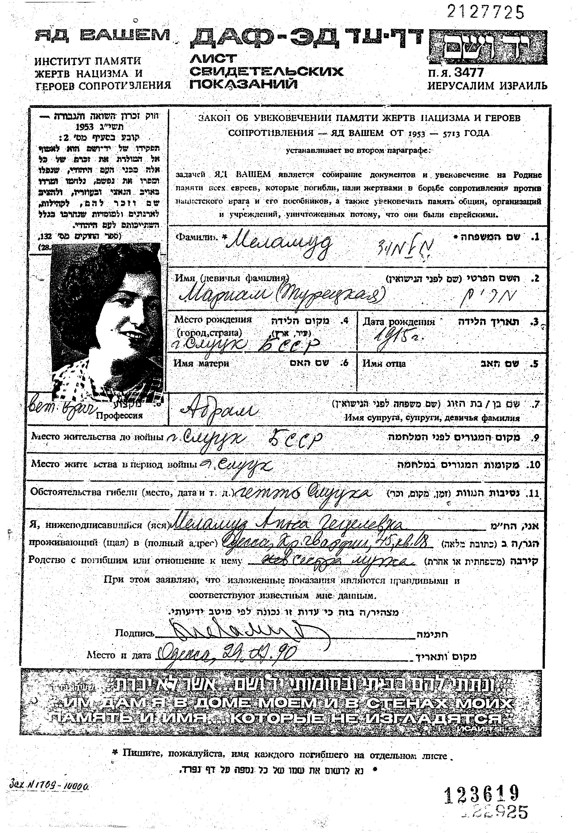 Melamud | Miriam | 1915 | Slutsk, Weißrussland (UdSSR) | Gedenkblatt |