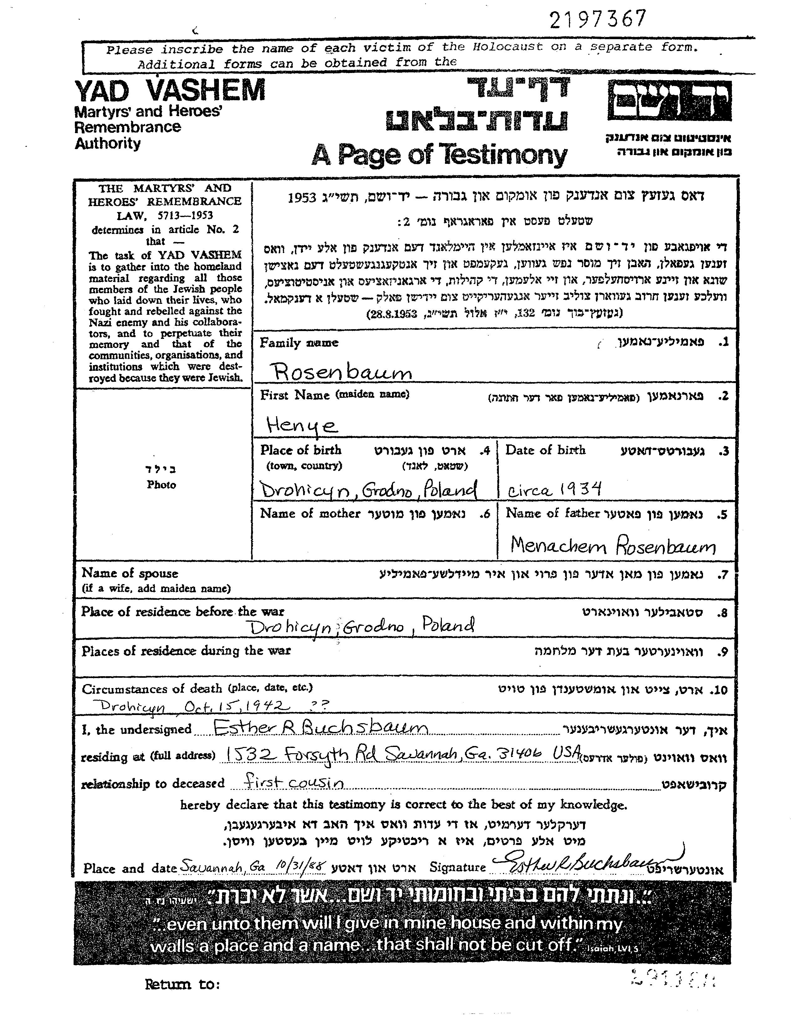 Rosenbaum | Henye | 1934 | Drohiczyn, Polen | Gedenkblatt |