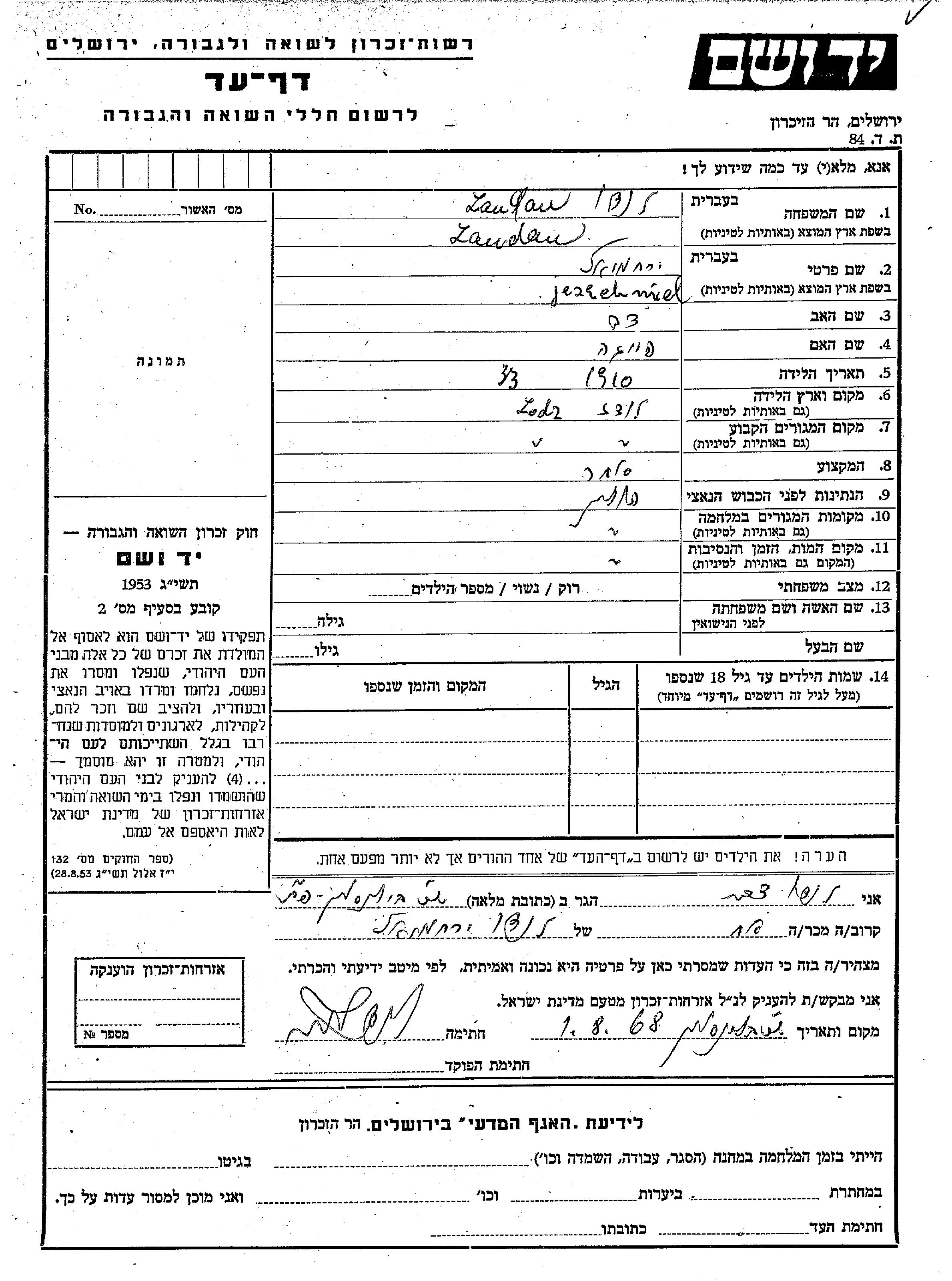 Yerakhmiel Boruch Landau wurde im Jahr 1911 in Łódź, Polen geboren. Er war Kaufmann/-frau. Vor dem Zweiten Weltkrieg lebte er in Łódź, Polen.