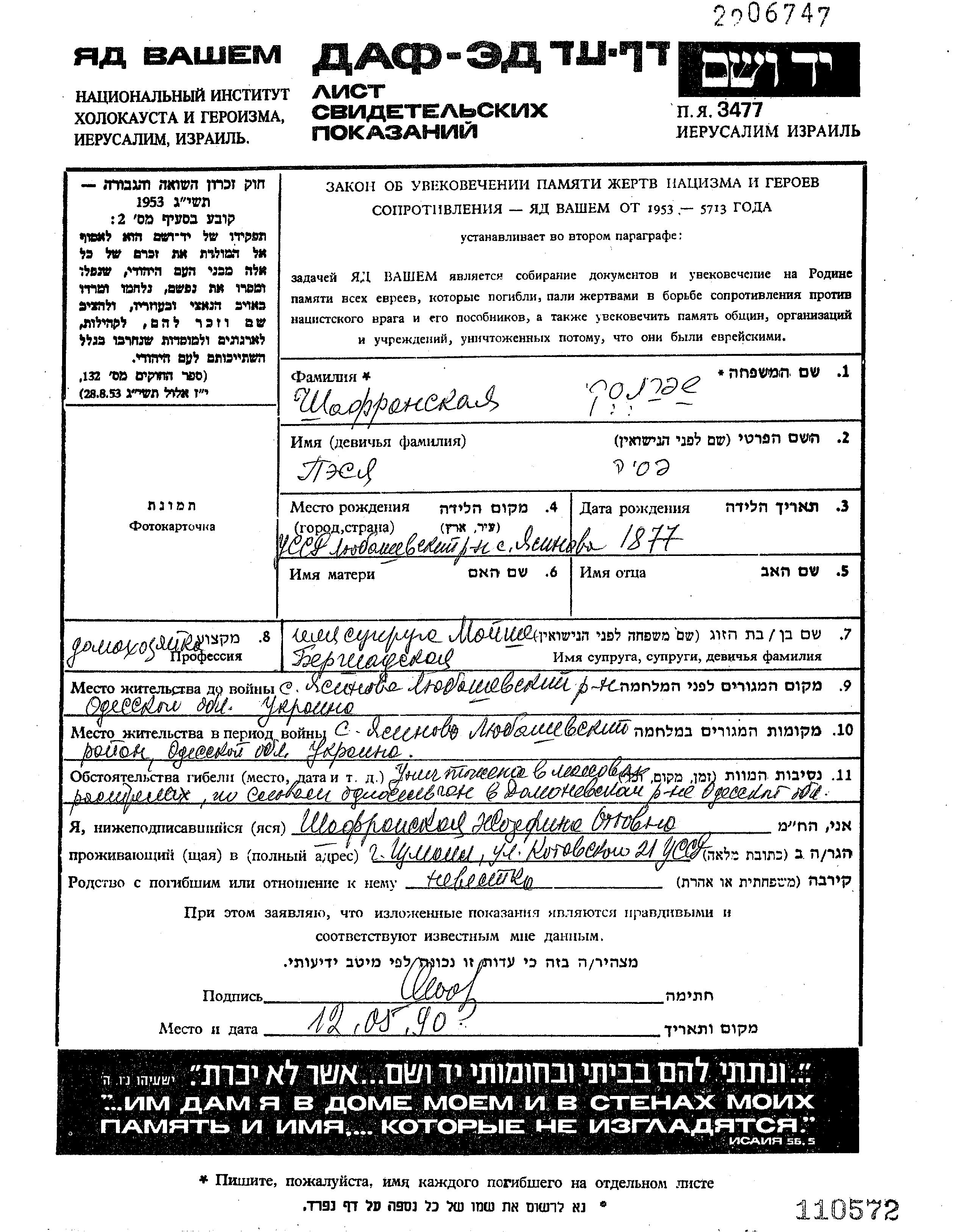 Pesia Peila Shafranski, geb. Bershadski wurde in Yasinova, Ukraine (UdSSR) geboren. Sie war Hausfrau. Vor dem Zweiten Weltkrieg lebte sie in Yasinova, Ukraine (UdSSR).