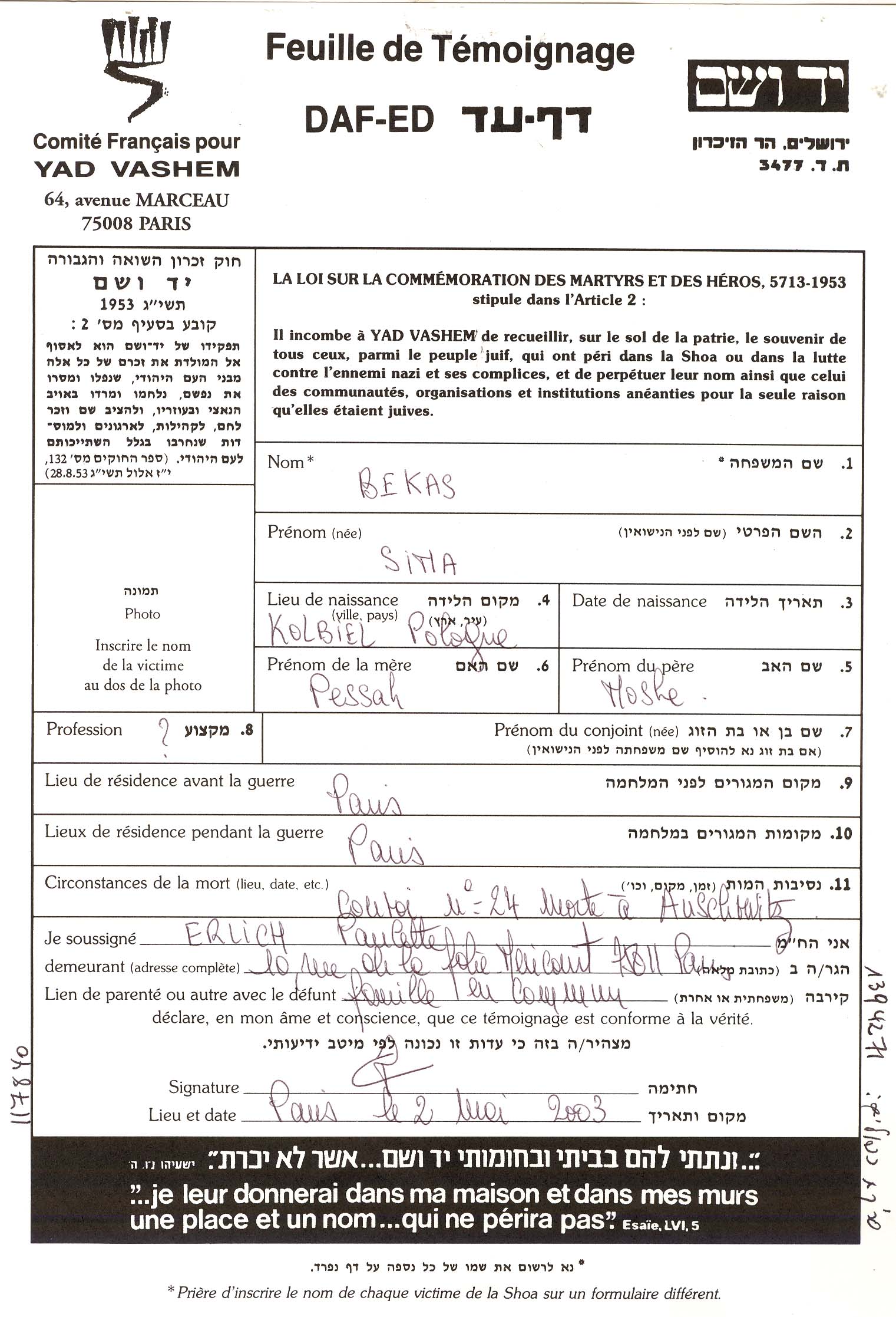 Sima Bekas Baks wurde im Jahr 1925 in Kolbiel, Polen geboren. Vor dem Zweiten Weltkrieg lebte sie in Paris, Frankreich.