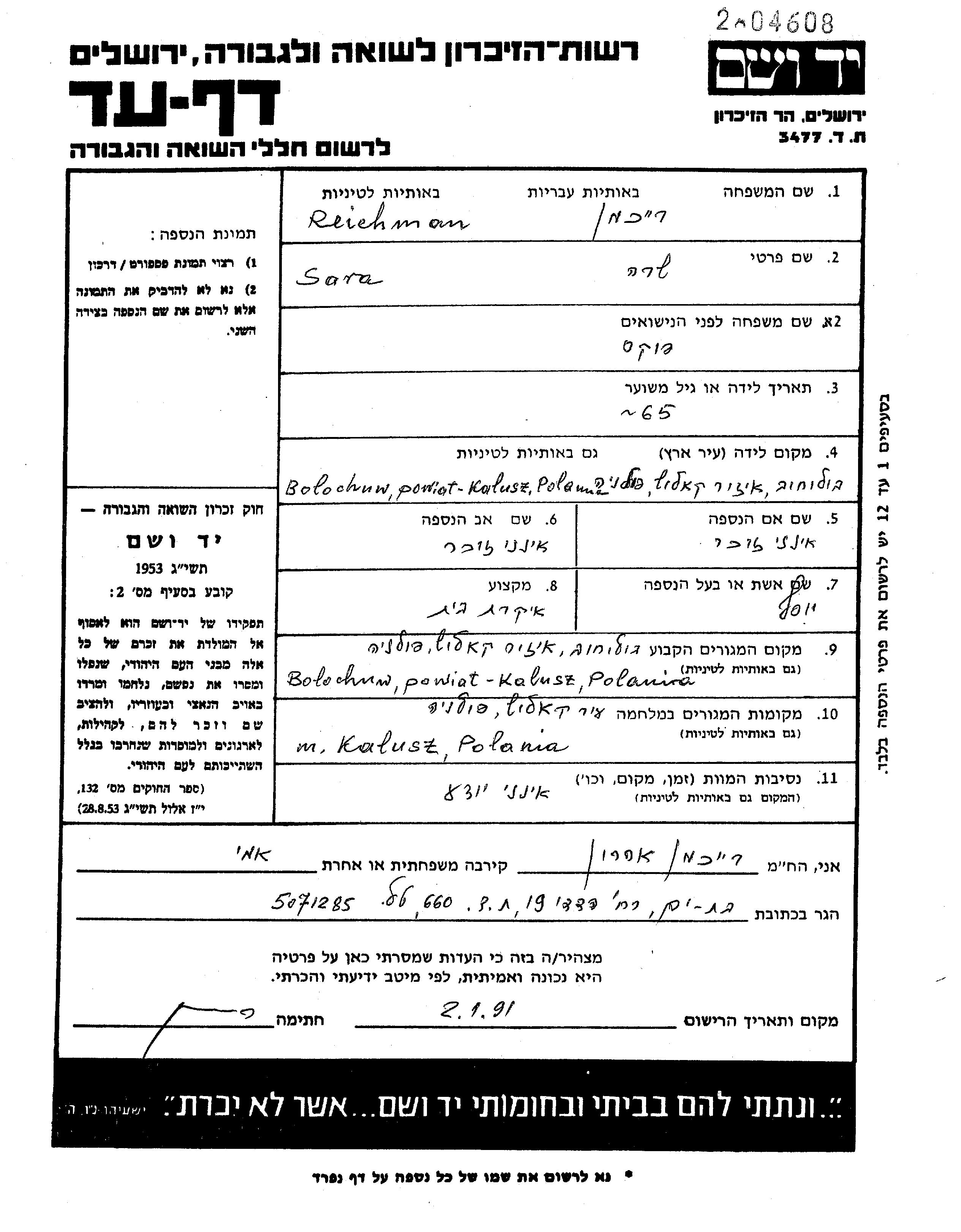 Sara Reichman, geb. Fuks wurde in Bolechow, Polen geboren. Sie war Hausfrau und mit Yosef Verheiratet. Vor dem Zweiten Weltkrieg lebte sie in Bolechow, Polen. Während des Krieges war sie in Kalusz, Polen.