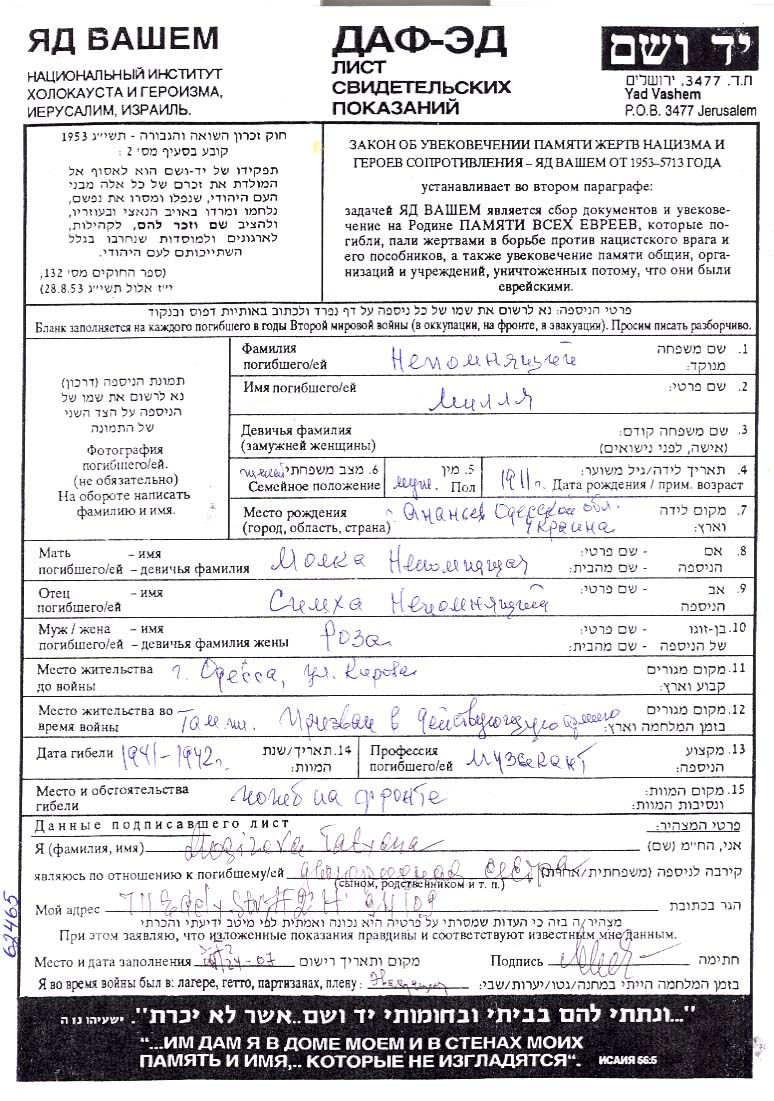 Milla Niepomyashezy wurde im Jahr 1905 in Ananyev, Ukraine (UdSSR) geboren. Vor dem Zweiten Weltkrieg lebte er in Odessa, Ukraine (UdSSR).