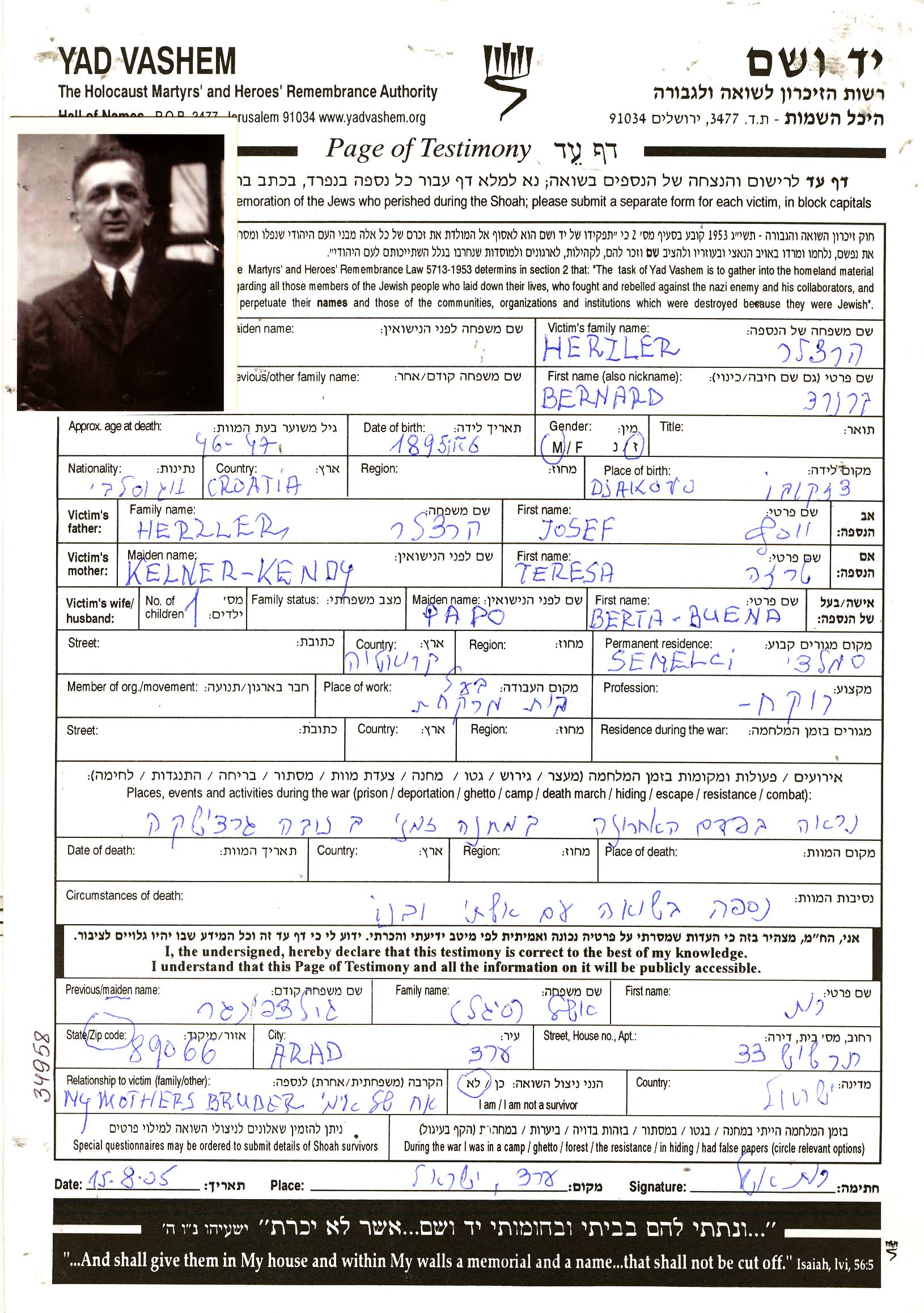 Herzler Bernard 1895 Semeljci, Jugoslawien Gedenkblatt