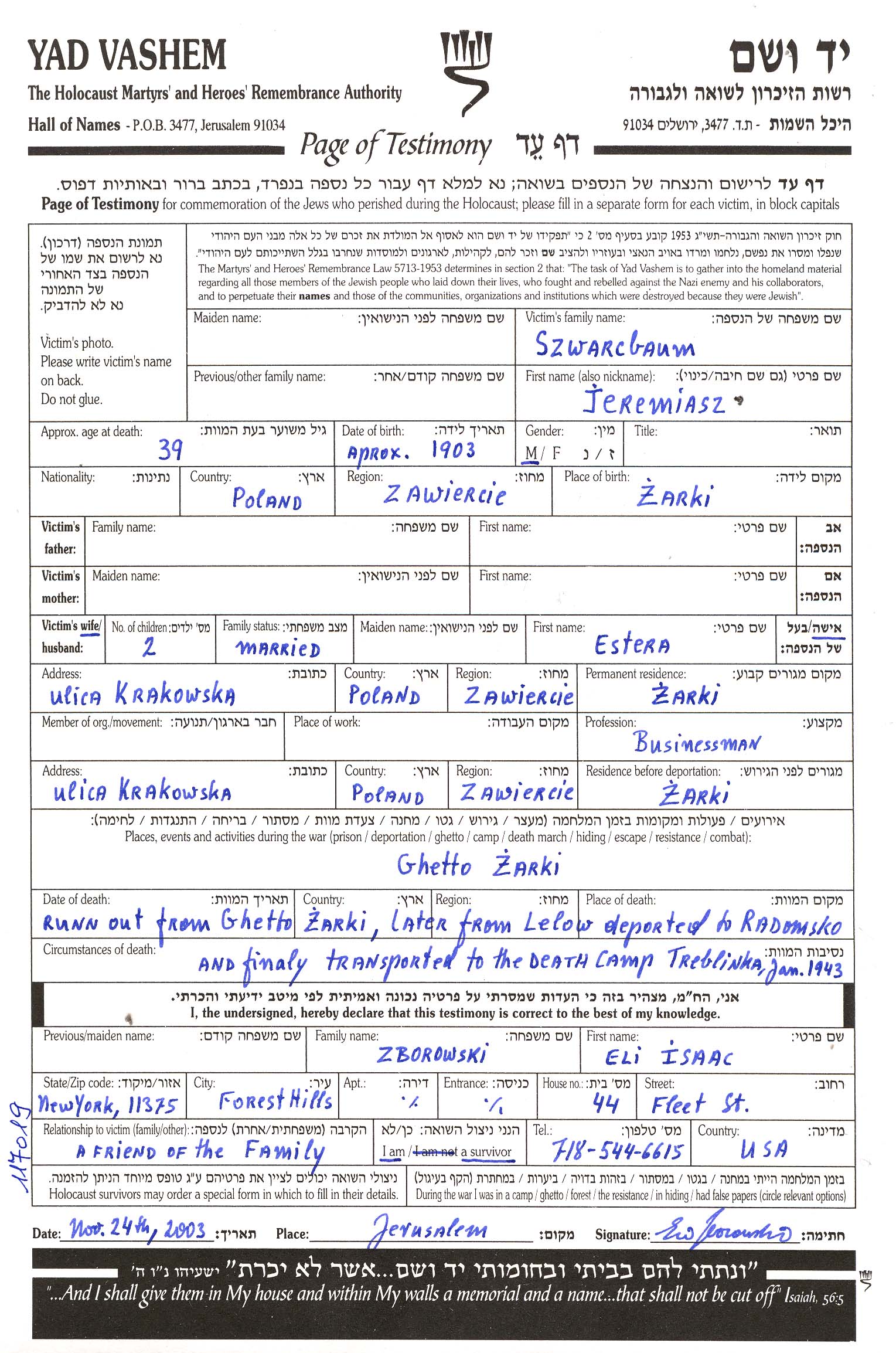 Szwarcbaum Jeremiasz 1903 Zarki, Polen Gedenkblatt
