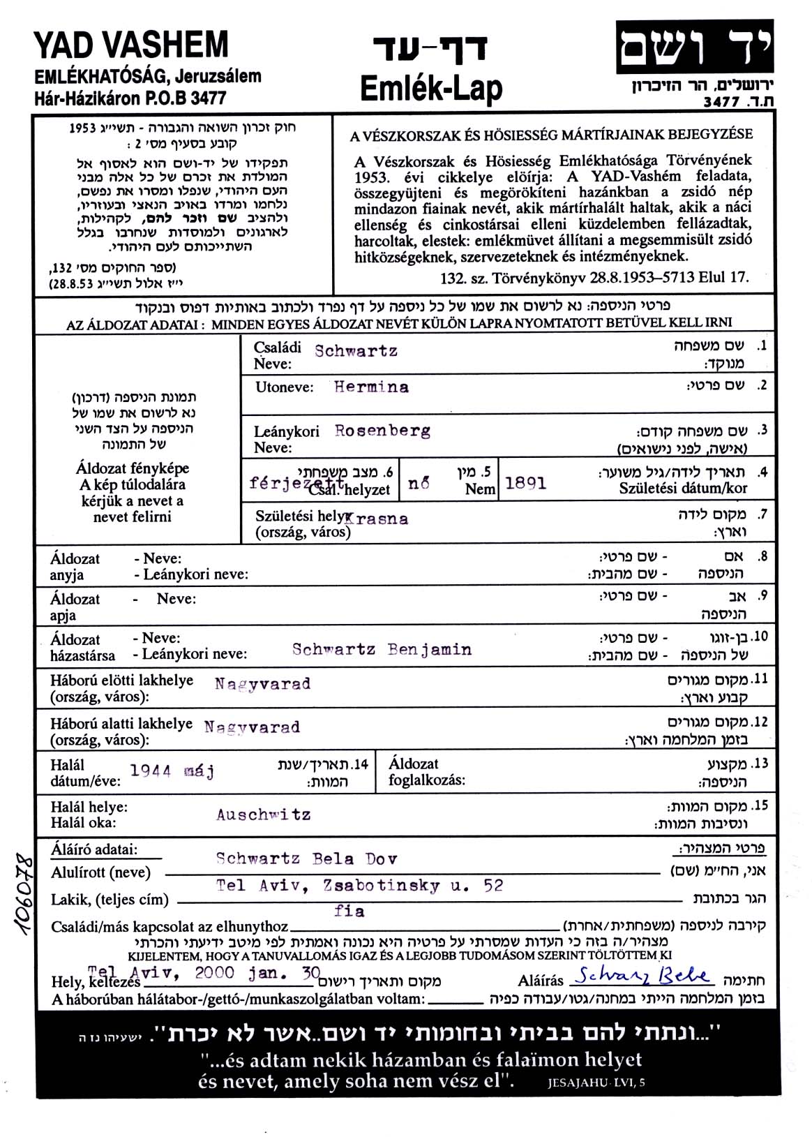 Schwartz | Hermina | 1891 | Oradea, Rumänien | Gedenkblatt |