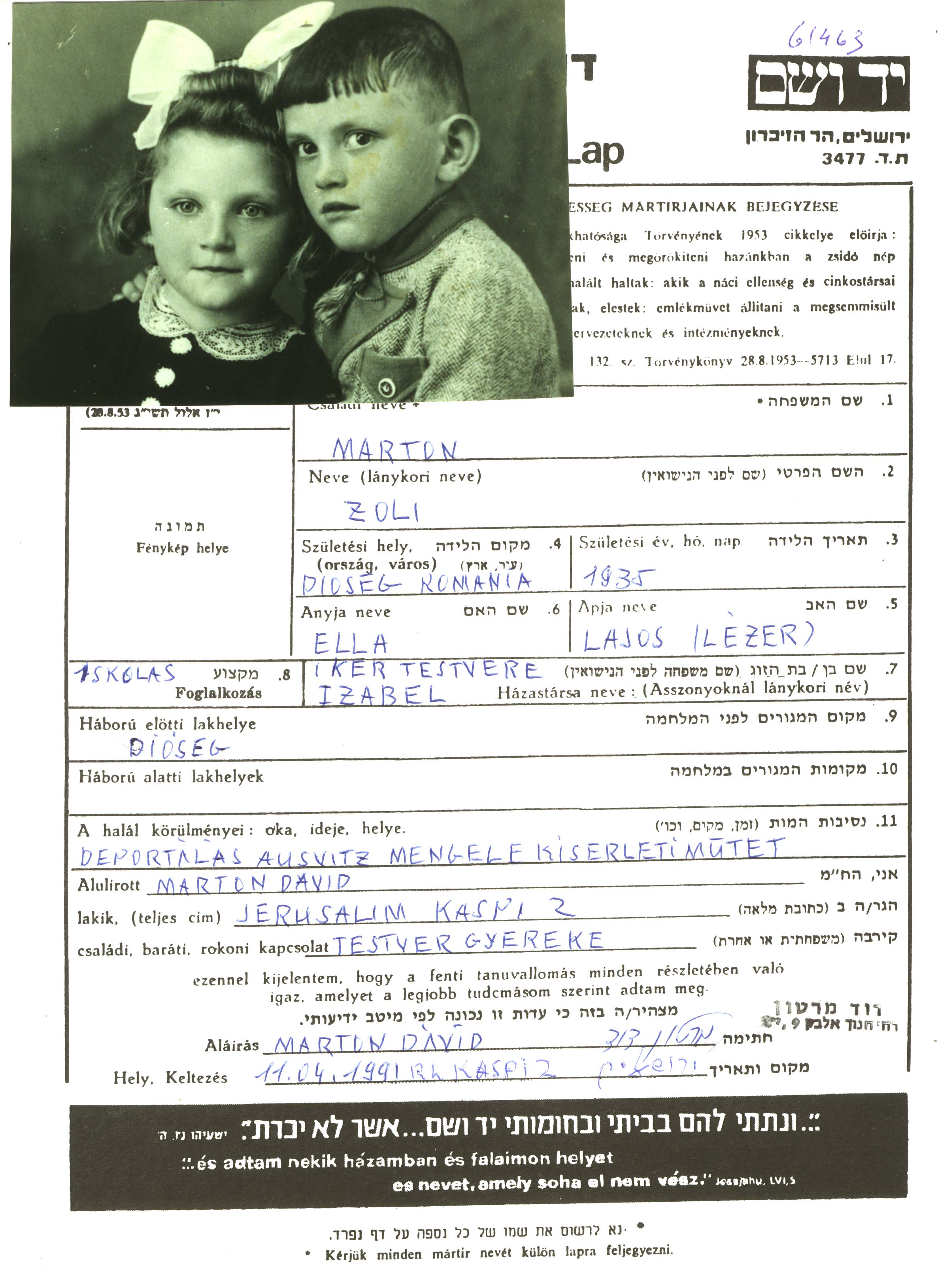 Zoli Marton wurde im Jahr 1935 in Diosig, Rumänien geboren. Er war Schüler/-in. Vor dem Zweiten Weltkrieg lebte er in Diosig, Rumänien.