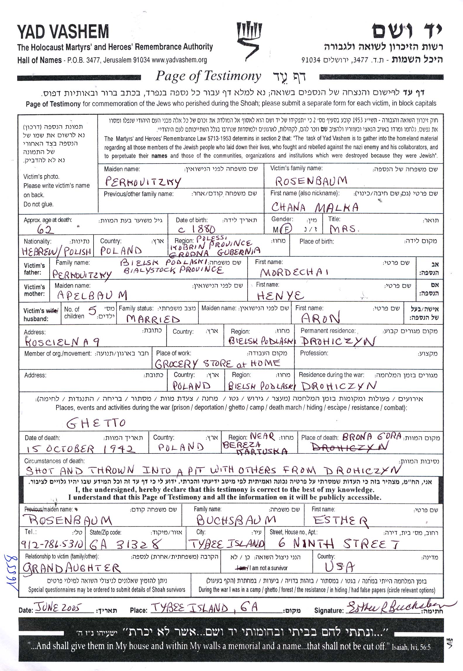 Chana Malka wurde in der Schoah ermordet. Todesort: Polesie, Polen im Jahr 15/10/1942.