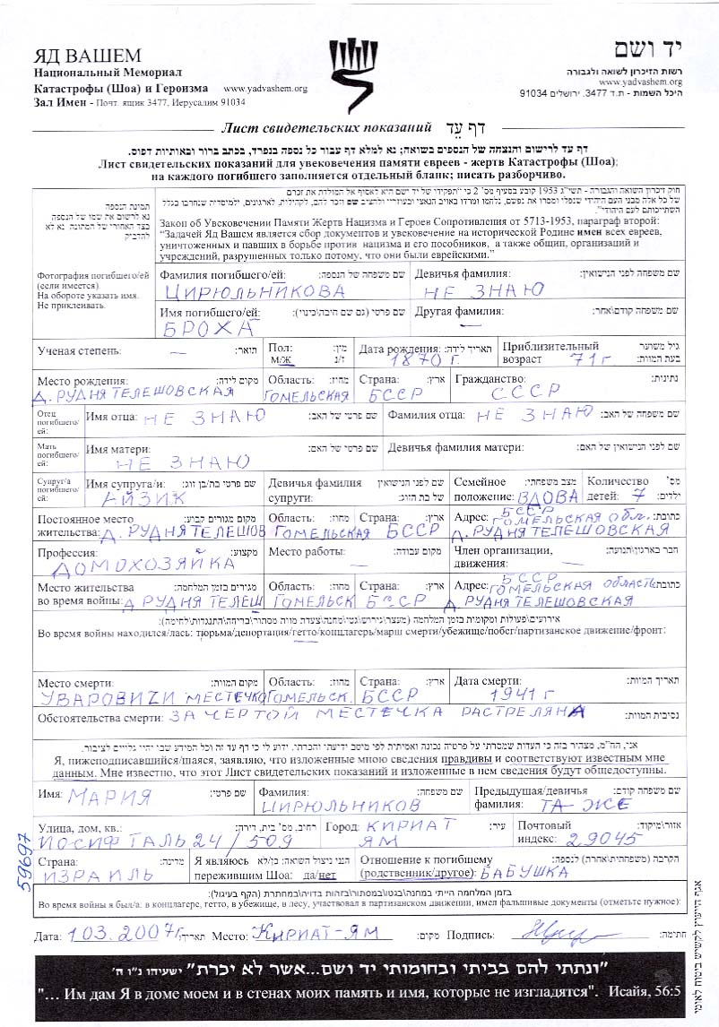 Brakha Tzirulnikov wurde im Jahr 1871 in Rudnya Teleshevskaya, Weißrussland (UdSSR) geboren. Vor dem Zweiten Weltkrieg lebte sie in Rudnya Teleshevskaya, Weißrussland (UdSSR).