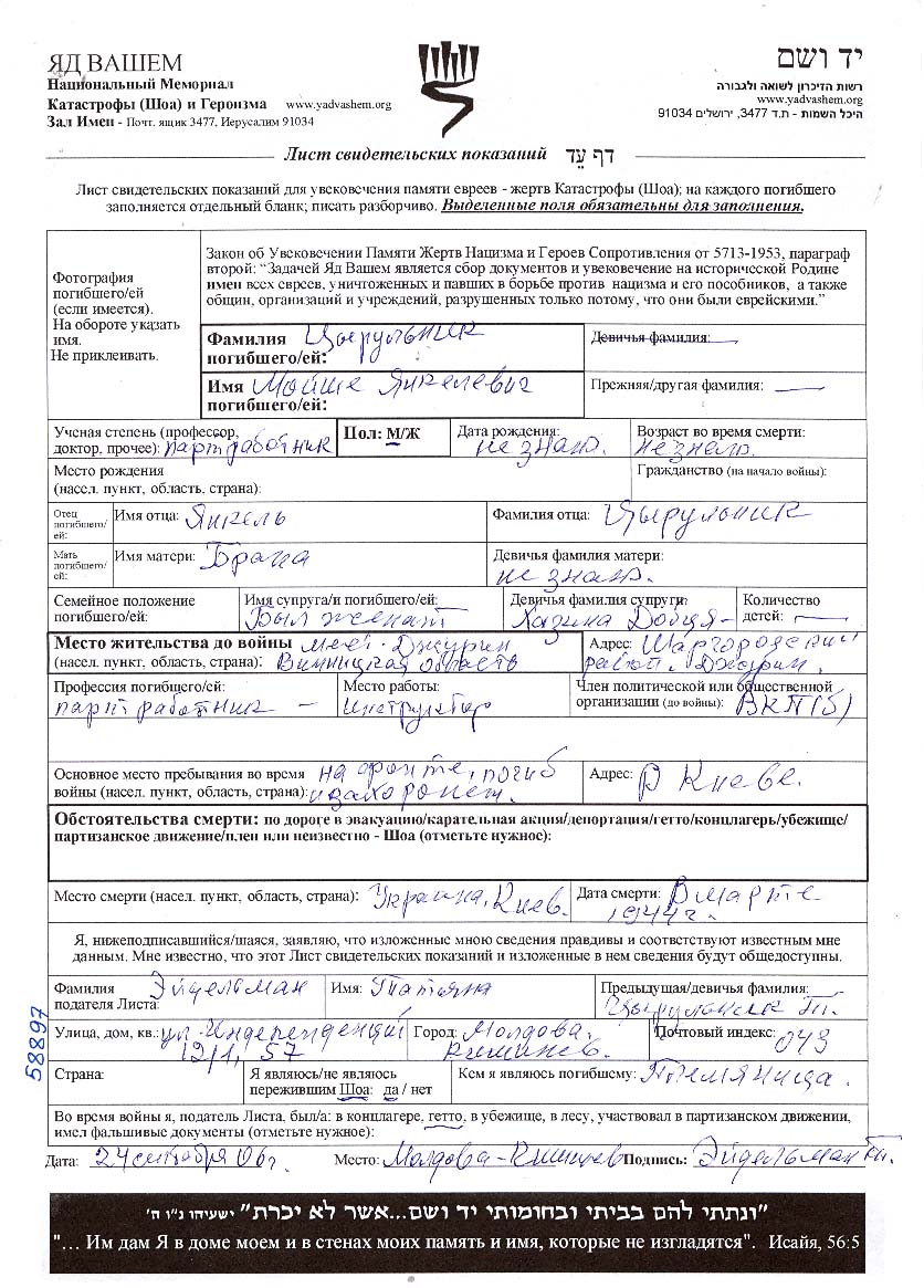 Moshe Tzyrulnik wurde in Dzhurin, Ukraine (UdSSR) geboren. Er war Parteiarbeiter. Vor dem Zweiten Weltkrieg lebte er in Dzhurin, Ukraine (UdSSR).