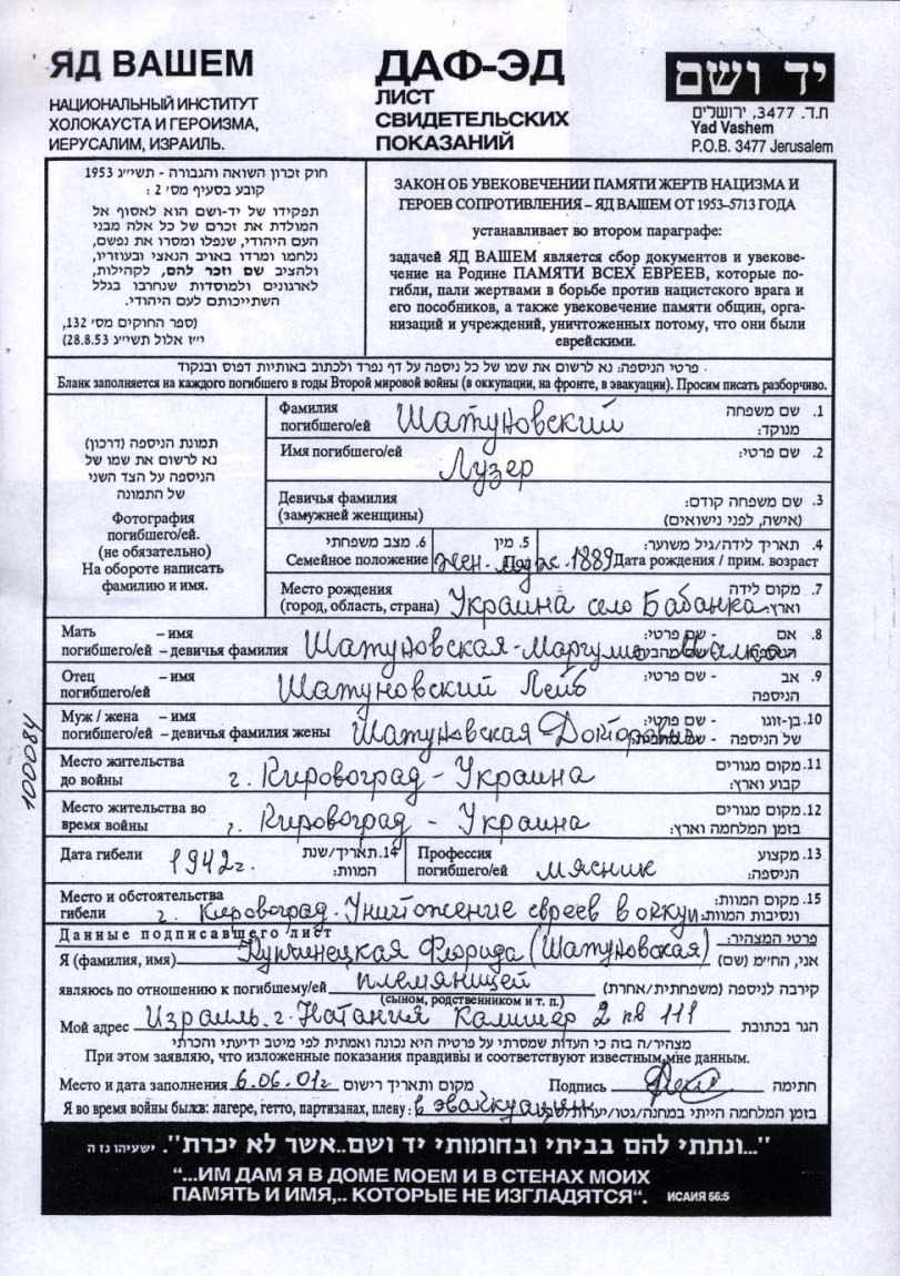 Luzer Shatunovski wurde im Jahr 1887 in Kirovograd, Ukraine (UdSSR) geboren. Er war Metzger/-in. Vor dem Zweiten Weltkrieg lebte er in Kirovograd, Ukraine (UdSSR).