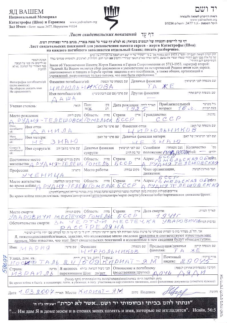 Tzirulnikova Dasha 1926 Rudnya, Weißrussland (UdSSR) Gedenkblatt
