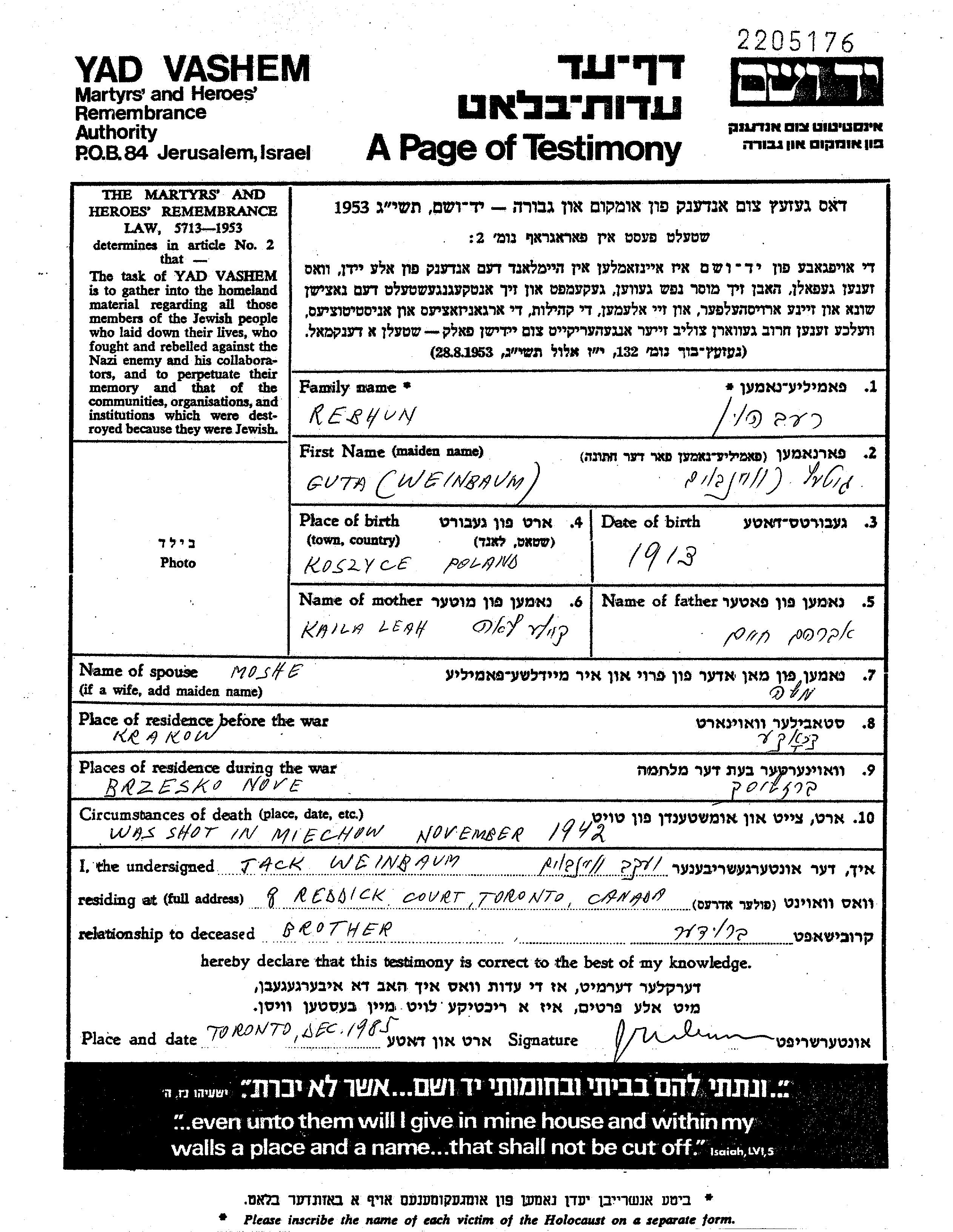 Gutl Rebhun, geb. Weinbaum wurde im Jahr 1913 in Koszyce, Polen geboren. Sie war die Tochter von Avraham Khaim und Kaila Lea. Sie war mit Moshe Verheiratet. Vor dem Zweiten Weltkrieg lebte sie in Krakow, Polen. Während des Krieges war sie in Brzesko Nowe, Polen.