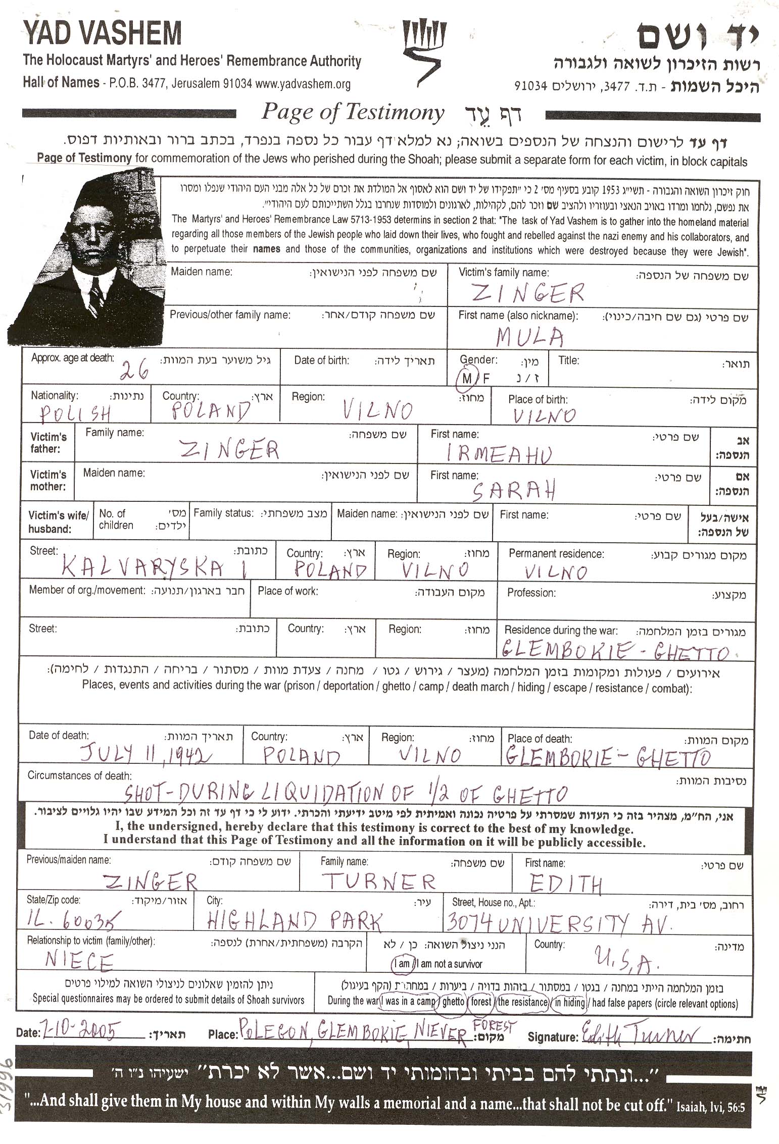 Mula Singer wurde im Jahr 1909 in Glebokie, Polen geboren. Vor dem Zweiten Weltkrieg lebte er in Wilno, Polen.
