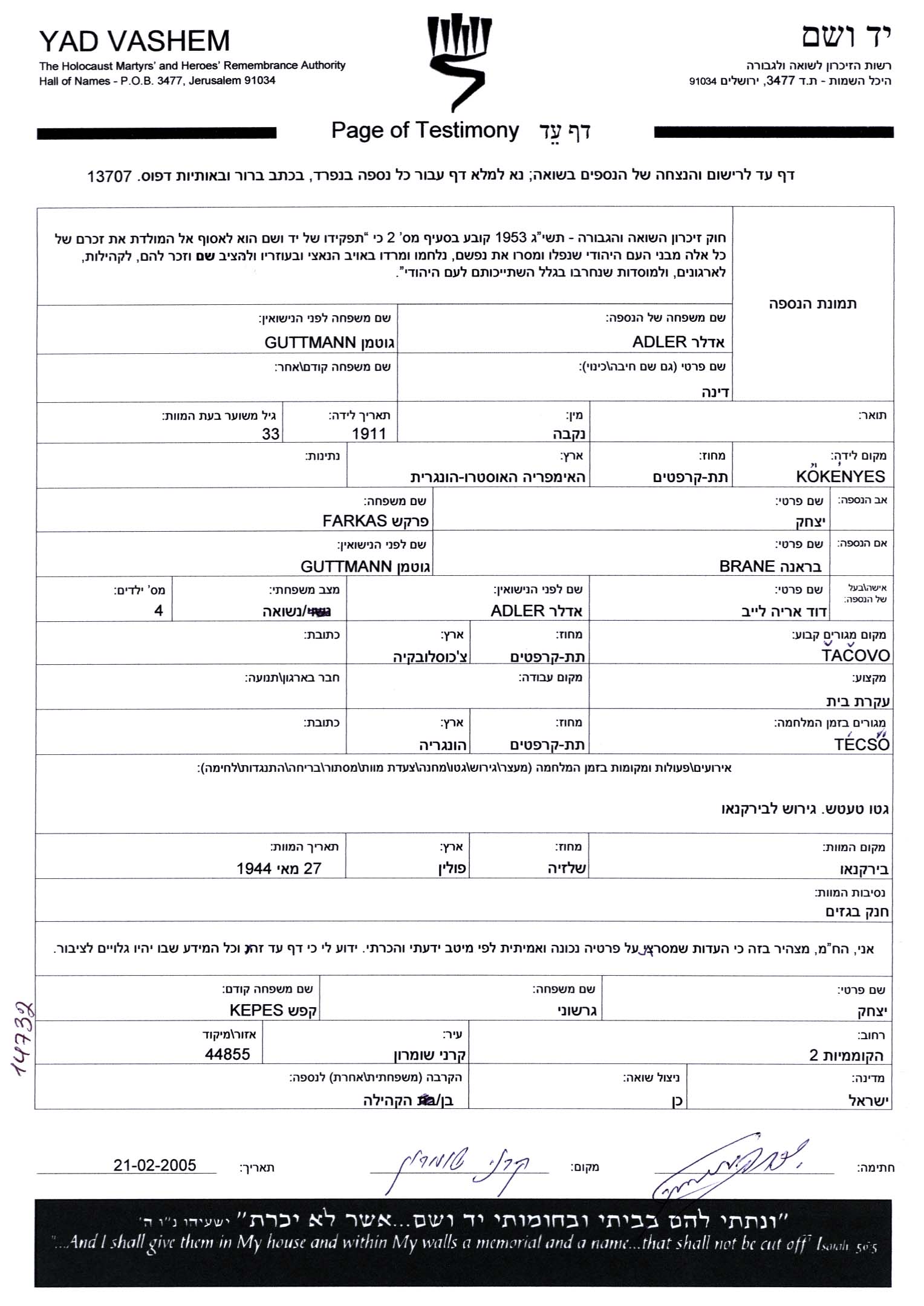 Dina Adler, geb. Farkash wurde im Jahr 1911 in Tarnava, Tschechoslowakei geboren. Sie war Hausfrau. Vor dem Zweiten Weltkrieg lebte sie in Tacovo, Tschechoslowakei.