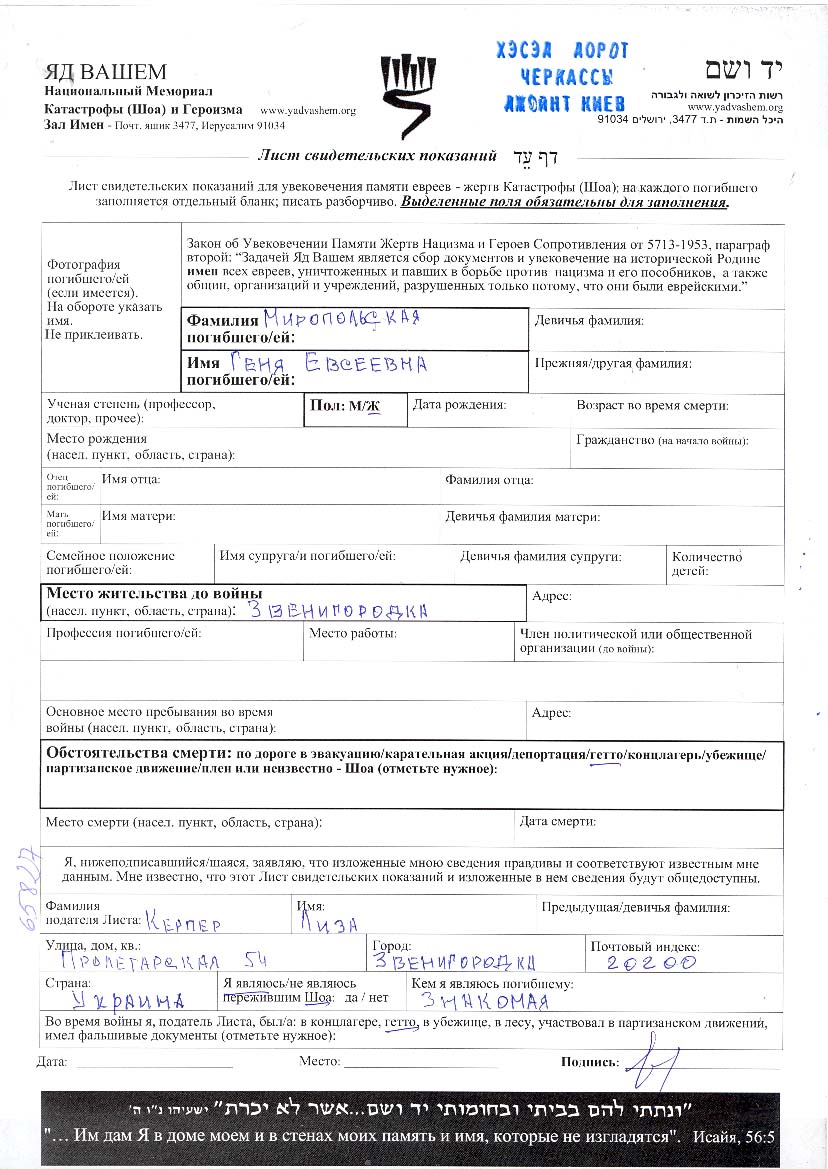 Miropolskaya | Genia | Zvenigorodka, Ukraine (UdSSR) | Gedenkblatt | |