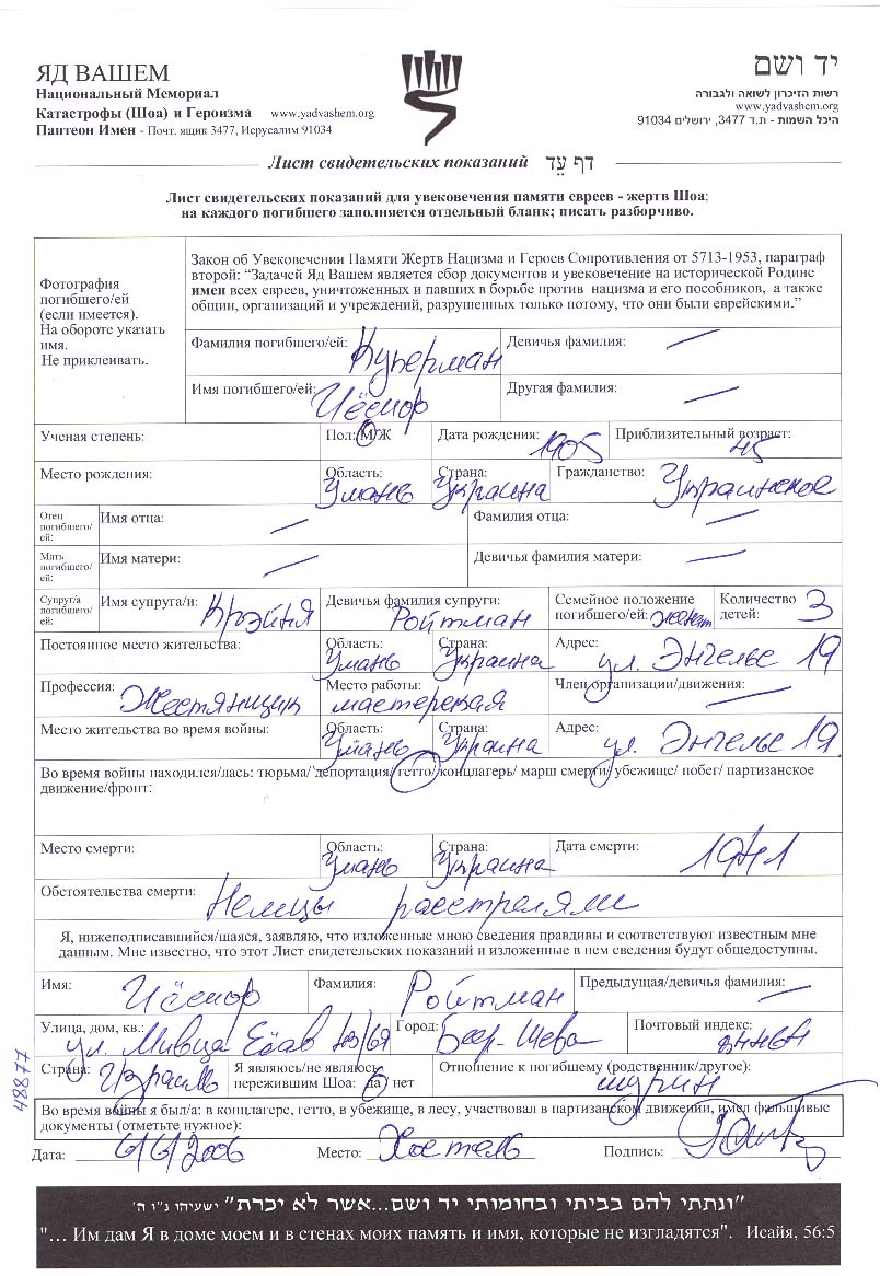 Yosef wurde in der Schoah ermordet. Todesort: Uman, Ukraine (UdSSR).