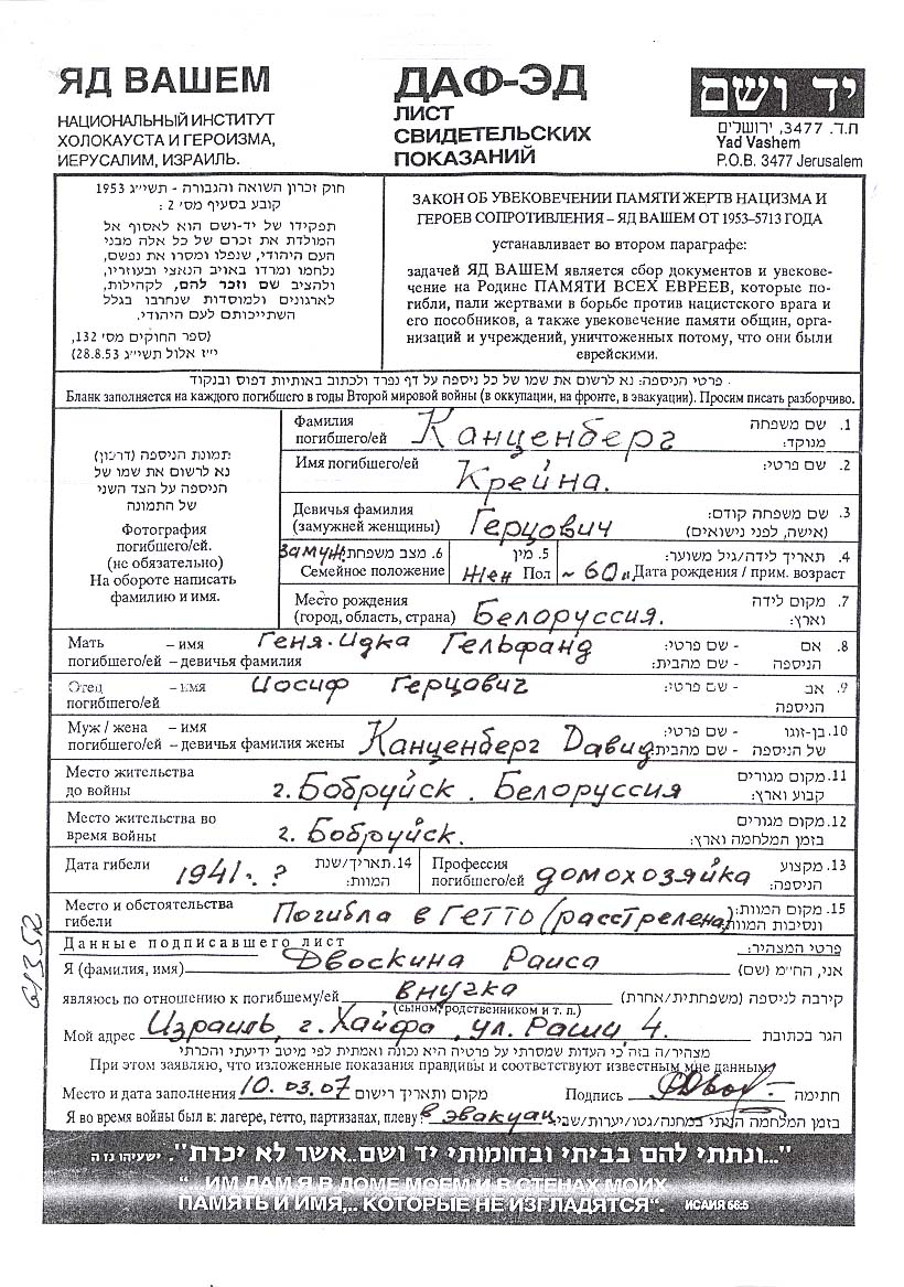 Kreina Katzenberg, geb. Gertzovich wurde in Weißrussland (UdSSR) geboren. Sie war Hausfrau. Vor dem Zweiten Weltkrieg lebte sie in Bobruysk, Weißrussland (UdSSR).