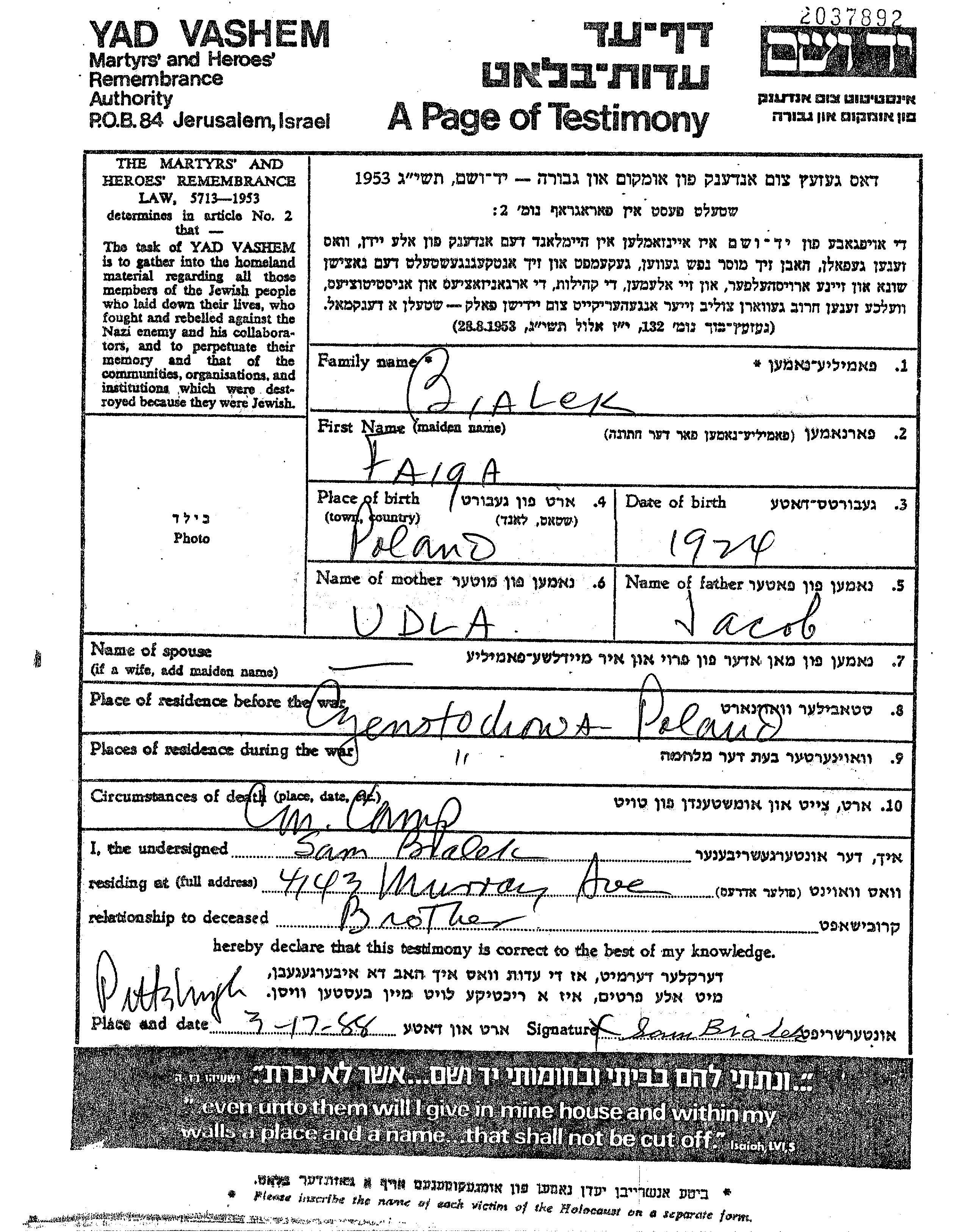 Faiga Bialek wurde im Jahr 1924 in Polen geboren. Sie war die Tochter von Jacob und Udla. Vor dem Zweiten Weltkrieg lebte sie in Czestochowa, Polen. Während des Krieges war sie in Czestochowa, Polen.