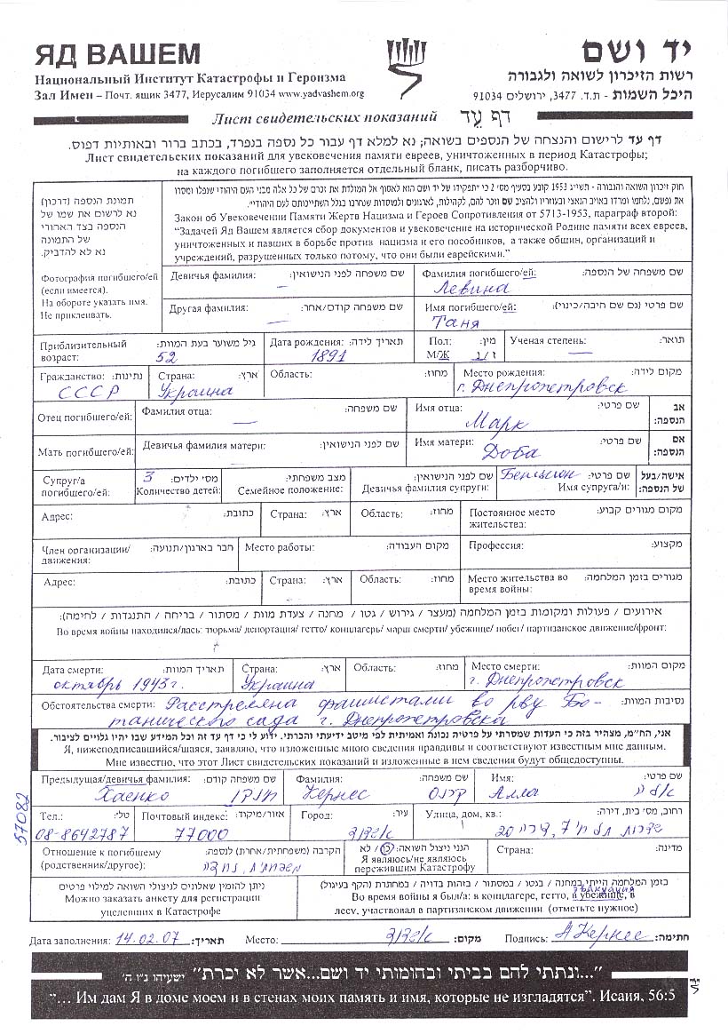 Tatyana wurde in der Schoah ermordet. Todesort: unbekannter Ort.