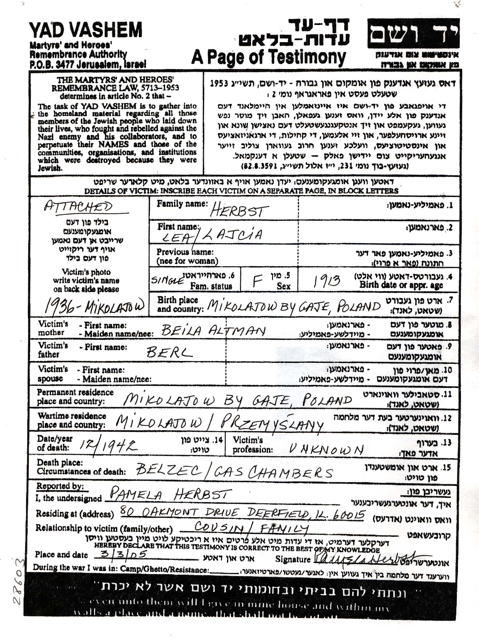Lajcia Herbst wurde in Mikolajow, Polen geboren. Vor dem Zweiten Weltkrieg lebte sie in Mikolajow, Polen.