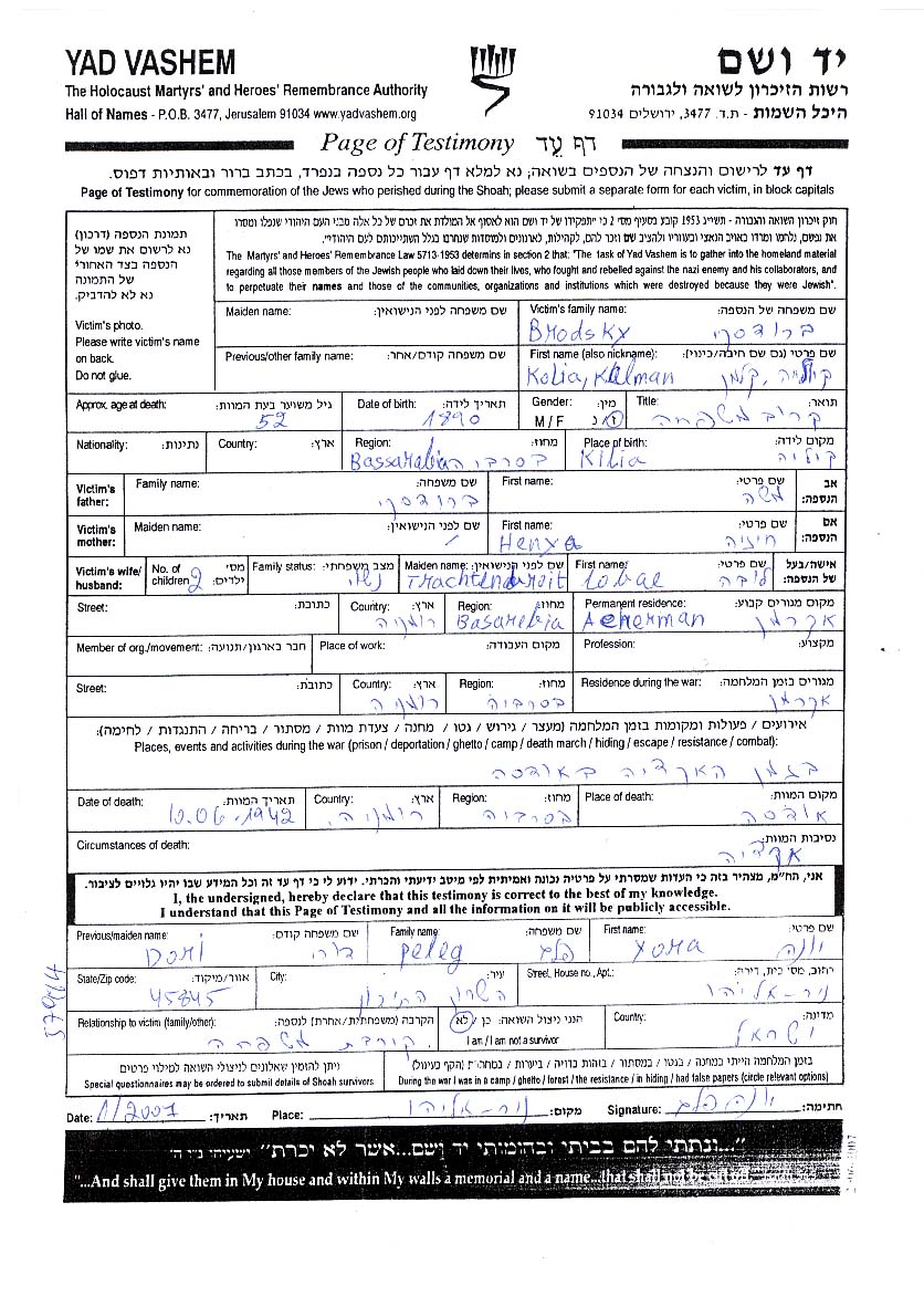 Kalman wurde in der Schoah ermordet. Todesort: Odessa, Ukraine (UdSSR) im Jahr 10/06/1942.