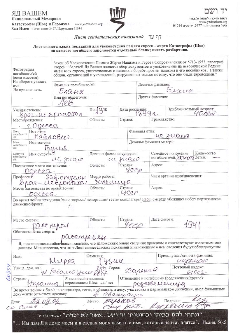 Lev Blank wurde im Jahr 1902 in Odessa, Ukraine (UdSSR) geboren. Er war Arzt/ärztin. Vor dem Zweiten Weltkrieg lebte er in Odessa, Ukraine (UdSSR).