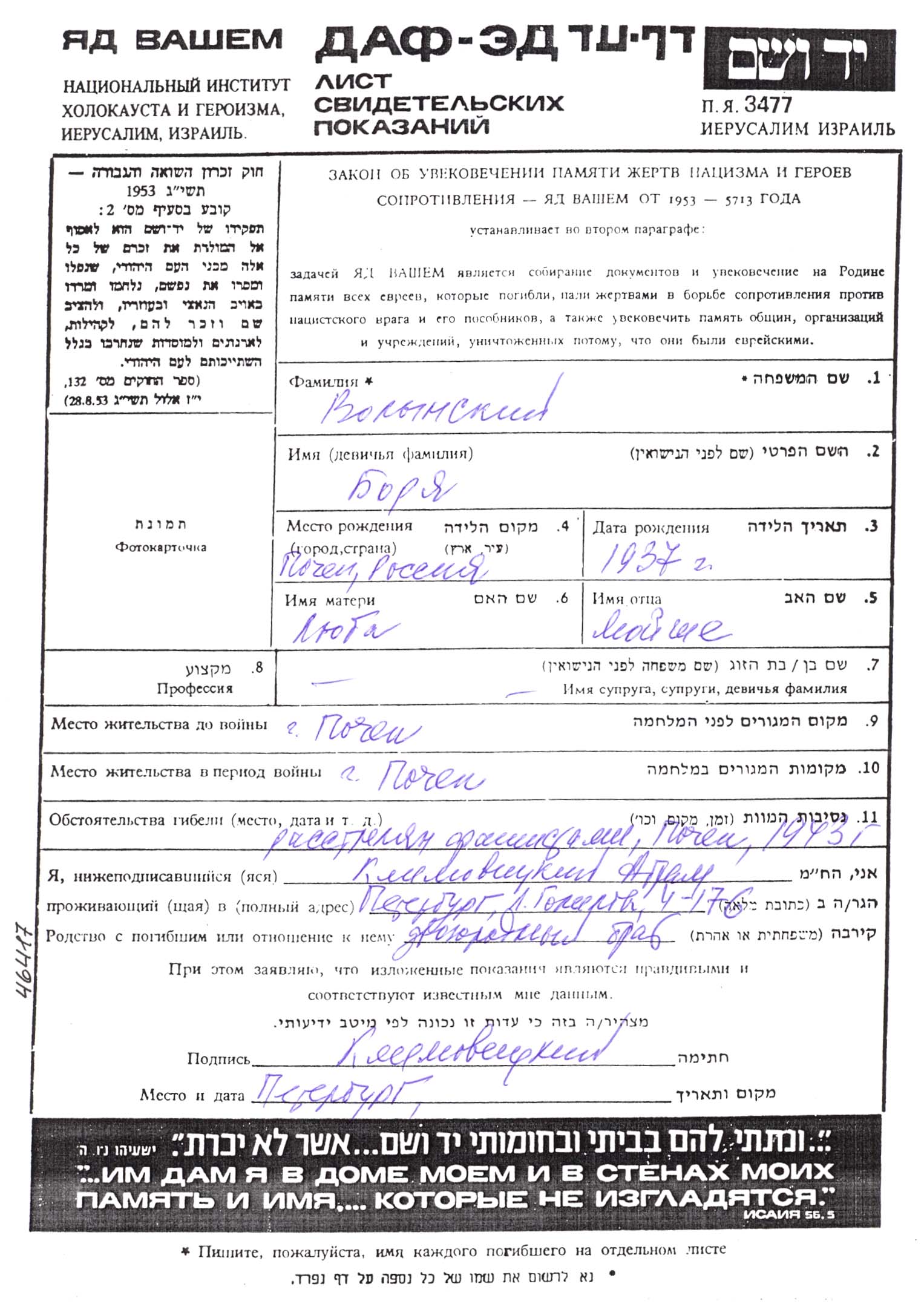 | Volinski | Boris | 1939 | Pochep, Russland (UdSSR) | Gedenkblatt |