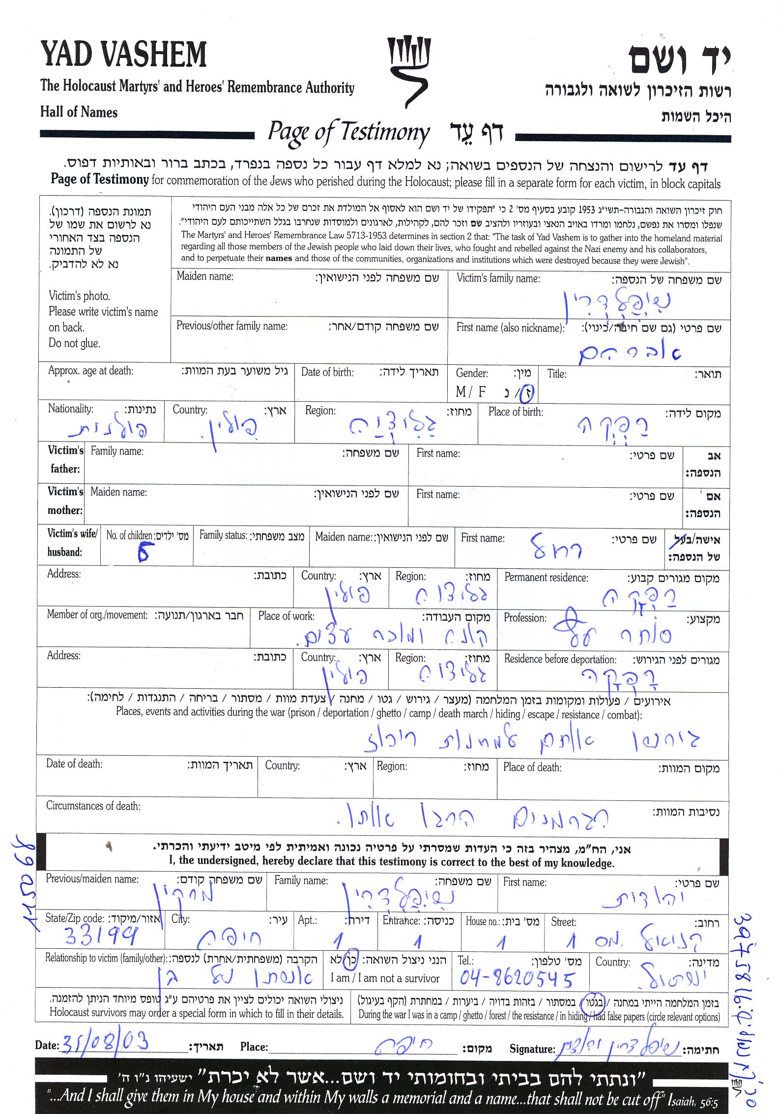 Stadt/Ortschaft oder Lager/Ghetto oder Bezirk/Region oder Land