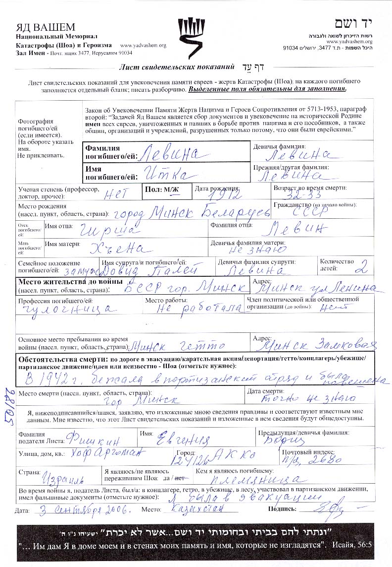 | Levin Palei | Ida | 1911 | Minsk, Weißrussland (UdSSR) | Gedenkblatt |