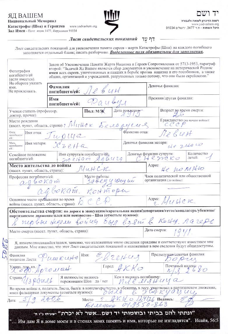 | Levin | Faiva | 1915 | Minsk, Weißrussland (UdSSR) | Gedenkblatt |
