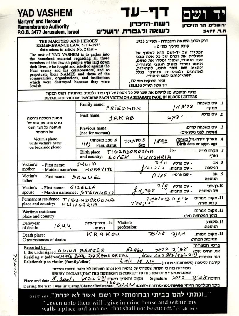 Shalom Yaakov Friedman wurde in Ungarn geboren. Er war Kaufmann/-frau. Vor dem Zweiten Weltkrieg lebte er in Tiszadorogma, Ungarn.