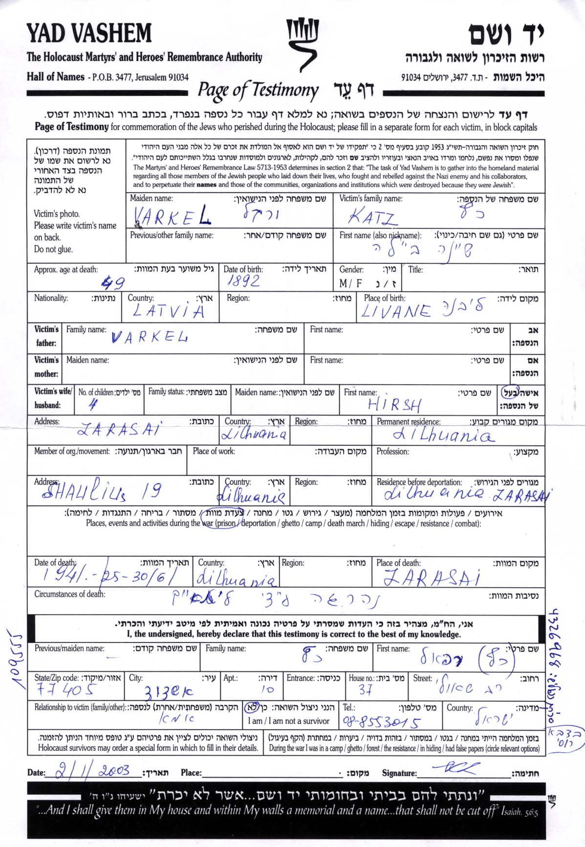 Perel Sheina Katz, geb. Varkel wurde im Jahr 1888 in Livani, Lettland geboren. Vor dem Zweiten Weltkrieg lebte sie in Zarasai, Litauen.