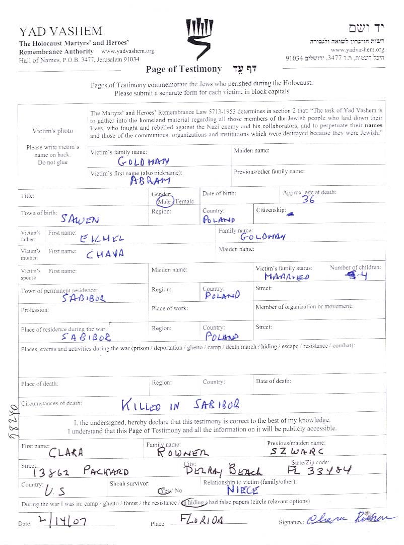 Abram Goldman wurde in Sawin, Polen geboren. Er war Viehhändler. Vor dem Zweiten Weltkrieg lebte er in Sobibor, Polen.